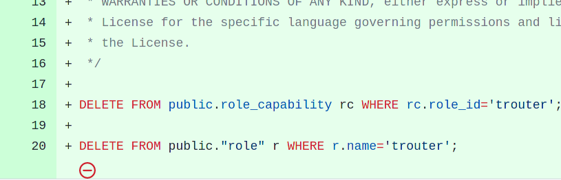 ########## traffic_ops/app/db/migrations/2023012316280200_create_new_role.down.sql: ########## @@ -0,0 +1,20 @@ +/* + * Licensed to the Apache Software Foundation (ASF) under one or more + * contributor license agreements. See the NOTICE file distributed with this + * work for additional information regarding copyright ownership. The ASF + * licenses this file to you under the Apache License, Version 2.0 (the + * "License"); you may not use this file except in compliance with the License. + * You may obtain a copy of the License at + * + * http://www.apache.org/licenses/LICENSE-2.0 + * + * Unless required by applicable law or agreed to in writing, software + * distributed under the License is distributed on an "AS IS" BASIS, WITHOUT + * WARRANTIES OR CONDITIONS OF ANY KIND, either express or implied. See the + * License for the specific language governing permissions and limitations under + * the License. + */ + +DELETE FROM public.role_capability rc WHERE rc.role_id='trouter'; + +DELETE FROM public."role" r WHERE r.name='trouter'; Review Comment: In order to be POSIX-compliant, every file should end with a newline.  ########## traffic_ops/app/db/migrations/2023012316280200_create_new_role.up.sql: ########## @@ -0,0 +1,33 @@ +/* + * Licensed to the Apache Software Foundation (ASF) under one or more + * contributor license agreements. See the NOTICE file distributed with this + * work for additional information regarding copyright ownership. The ASF + * licenses this file to you under the Apache License, Version 2.0 (the + * "License"); you may not use this file except in compliance with the License. + * You may obtain a copy of the License at + * + * http://www.apache.org/licenses/LICENSE-2.0 + * + * Unless required by applicable law or agreed to in writing, software + * distributed under the License is distributed on an "AS IS" BASIS, WITHOUT + * WARRANTIES OR CONDITIONS OF ANY KIND, either express or implied. See the + * License for the specific language governing permissions and limitations under + * the License. + */ + +INSERT INTO public."role" (name, description, priv_level) +VALUES('trouter', 'Limited role for Traffic Router calls to Traffic Ops', 10); + +INSERT INTO public.role_capability (role_id, cap_name) + VALUES ( + (SELECT id FROM role WHERE name='trouter'), + UNNEST(ARRAY[ + 'CDN:READ', + 'DELIVERY-SERVICE:READ', + 'DNS-SEC:READ', + 'FEDERATION:READ', + 'STEERING:READ', + 'FEDERATION-RESOLVER:READ', + 'DS-SECURITY-KEY:READ'] + ) + ); Review Comment: Another file needing to end with a newline ########## CHANGELOG.md: ########## @@ -25,6 +25,7 @@ The format is based on [Keep a Changelog](http://keepachangelog.com/en/1.0.0/). - [#7113](https://github.com/apache/trafficcontrol/pull/7113) *Traffic Portal* Minimize the Server Server Capability part of the *Traffic Servers* section of the Snapshot Diff - [#7273](https://github.com/apache/trafficcontrol/pull/7273) *Traffic Ops* Adds SSL-KEY-EXPIRATION:READ permission to operations, portal, read-only, federation and steering roles - [#7296](https://github.com/apache/trafficcontrol/pull/7296) *Traffic Portal* New configuration option in `traffic_portal_properties.json` at `deliveryServices.exposeInactive` controls exposing APIv5 DS Active State options in the TP UI. +- [#7309](https://github.com/apache/trafficcontrol/pull/7309) *Traffic Ops* Creates new role `trouter` with CDN:READ, DELIVERY-SERVICE:READ, DNS-SEC:READ, FEDERATION:READ, STEERING:READ, FEDERATION-RESOLVER:READ, DS-SECURITY-KEY:READ Review Comment: No need to list the precise permissions, just mentioning it's the ones TR needs to watch TO resources should be enough ########## traffic_ops/app/db/migrations/2023012316280200_create_new_role.down.sql: ########## @@ -0,0 +1,20 @@ +/* + * Licensed to the Apache Software Foundation (ASF) under one or more + * contributor license agreements. See the NOTICE file distributed with this + * work for additional information regarding copyright ownership. The ASF + * licenses this file to you under the Apache License, Version 2.0 (the + * "License"); you may not use this file except in compliance with the License. + * You may obtain a copy of the License at + * + * http://www.apache.org/licenses/LICENSE-2.0 + * + * Unless required by applicable law or agreed to in writing, software + * distributed under the License is distributed on an "AS IS" BASIS, WITHOUT + * WARRANTIES OR CONDITIONS OF ANY KIND, either express or implied. See the + * License for the specific language governing permissions and limitations under + * the License. + */ + +DELETE FROM public.role_capability rc WHERE rc.role_id='trouter'; Review Comment: >> No need to delete from `role_capability` here, since `role_id` is a foreign key an `DELETE` cascasdes >> >> https://github.com/apache/trafficcontrol/blob/396d474320f0628b72bb407efc795ac4cacde6cd/traffic_ops/app/db/create_tables.sql#L3772-L3773 > > Removed line to delete on `role_capability`. Assuming what you are say, that when it deletes `role` it will remove it from `role_capability` as well. `DELETE FROM public.role_capability` came back and should be removed again 🙂 -- This is an automated message from the Apache Git Service. To respond to the message, please log on to GitHub and use the URL above to go to the specific comment. To unsubscribe, e-mail: [email protected] For queries about this service, please contact Infrastructure at: [email protected]