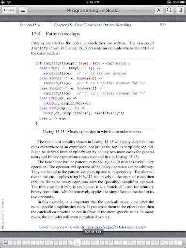 Funny -- I've been reading Programming in Scala as a PDF too :-) Here's an iPad screen capture from the page I happened to be on: