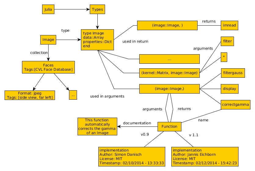 As previously announced by Simon Danisch, I want to present our online library concept for Julia. It's an online library based on a graph-database, that is supposed to enable a very rich feature set including uploading and versioning of code, search for code and documentation, automated tests etc… For starters, it will be more of an advanced interface for searching packages and documentation. This might be a little hard to justify, as the package system combined with Github already does a great job. But I think the idea behind it becomes understandable, when you think about scaling up the feature set in the future. You could probably implement every feature you would like to be independent from each another, say as different libraries or tools. For example make an extra interface for an image library, a library for statistical data sets, a library for binary dependencies, a library for tutorials and examples, a forum for discussions/bug-reports, etc.... But I think it's extremely useful to have all these different kind of "libraries" in one big library because the resources I listed all need to be treated very similar. They all might have tags, ratings, attached opinions/discussions, dependencies, are part of a hierarchy and finally, the search interface for them should be very similar. In a graph library, nodes get a higher level semantic meaning very easily, by just building connections. In the end this would also prevent fragmentation of information regarding the code over different systems or libraries. Just one example how things could be represented in an inhomogeneous graph-like structure. This is just a mock-up, as things are not consistent so far and might be represented differently in the final library: <https://lh3.googleusercontent.com/-lJ2meY5A_-A/U0VuCwhaNOI/AAAAAAAABj4/yJ1bPnwzktU/s1600/ImageExampleGraph.png> You can search for the English word "Image" and already get a first impression of what one can do with Julia and images. This would be especially cool, if it was deeply integrated into an IDE. You could just click on a particular datatype and get a display of what functions you could use on the type, or actually query example material. Similarly, you can look-up documentations, or code samples for functions and so forth... I hope you get the big picture! Another interesting use case is to combine the library with a good testing library, so that you can define tests for every function. Like this you can extend the library in an easy and controlled way. Someone can just upload a new version of a function, and if it passes the test for the function, it gets accepted. Together with benchmarks, one could even find out, if the new implementation is better, promoting it to the new standard implementation. This is far out for sure, as this needs a feature set similar to Github and beyond. But at some point, this might turn into version control system, which can make it very easy and conflict free to extend the functionality of Julia. As mentioned above the first steps will be to create an interface that lets you insert code and search for it intelligently, based on partially given information. Right from the start the system should allow for multiple competing implementations of one symbol and also take care of versions of the same functions. We are currently developing the first prototype of the database together with a simple IDE to connect to it. This happens in the scope of our Bachelor’s Thesis. The database is conceptually independent from the IDE but of course one does not make much sense without the other. So if you have any kind of feedback, ideas, wishes for features, inherent flaws you want to point out or just your two cents worth, let us know! We want to know what people working with/on Julia need. Thanks and cheers, Jannis & Simon