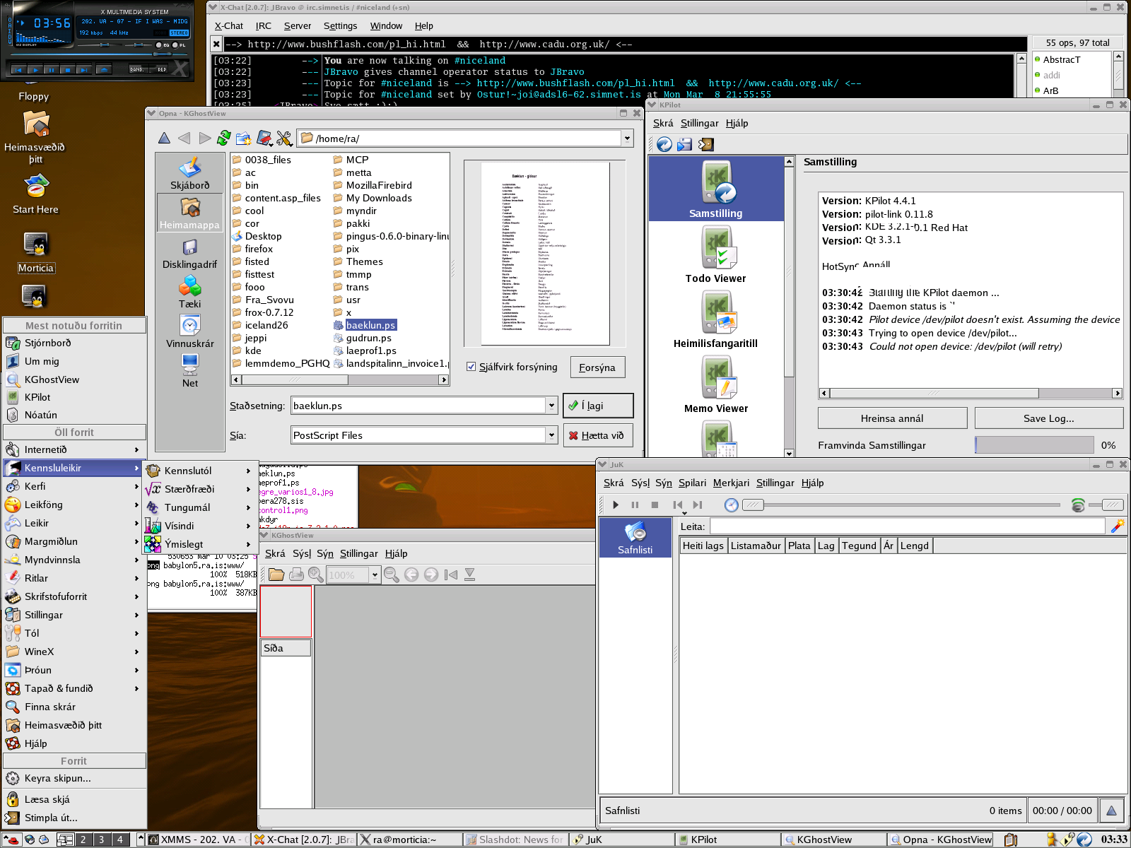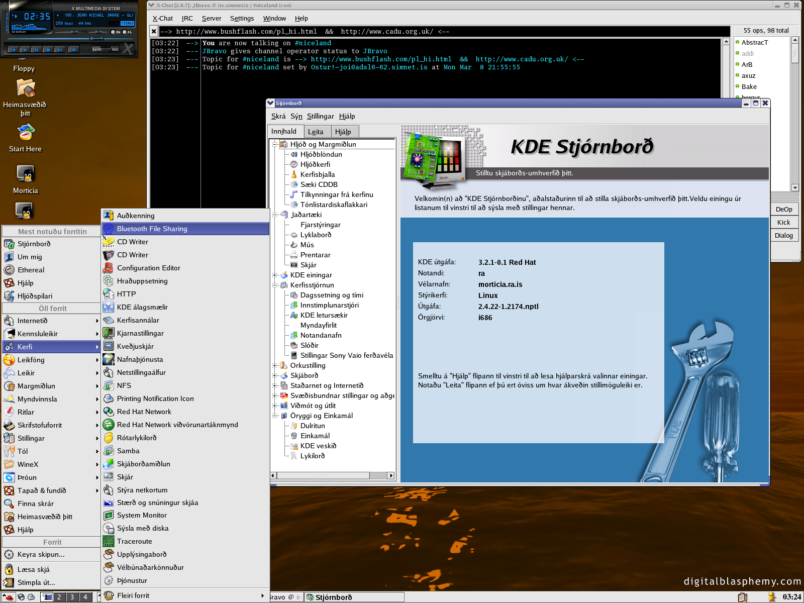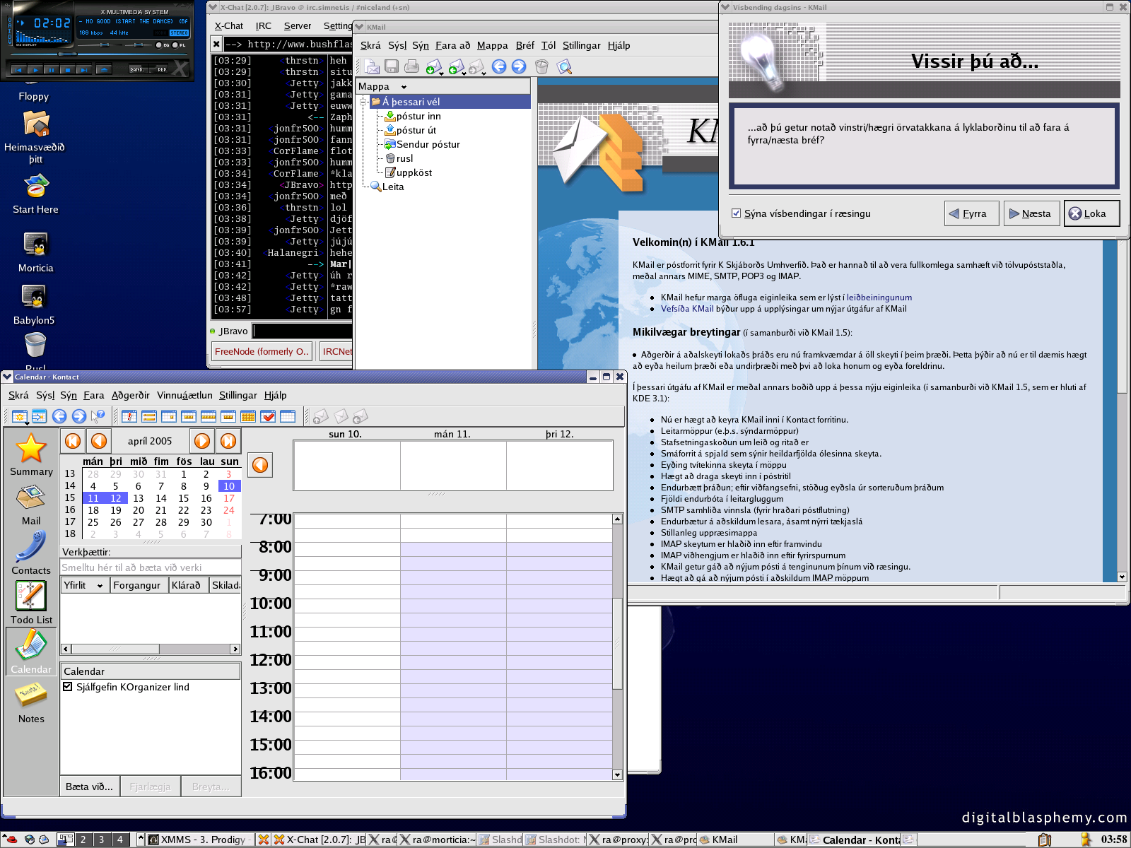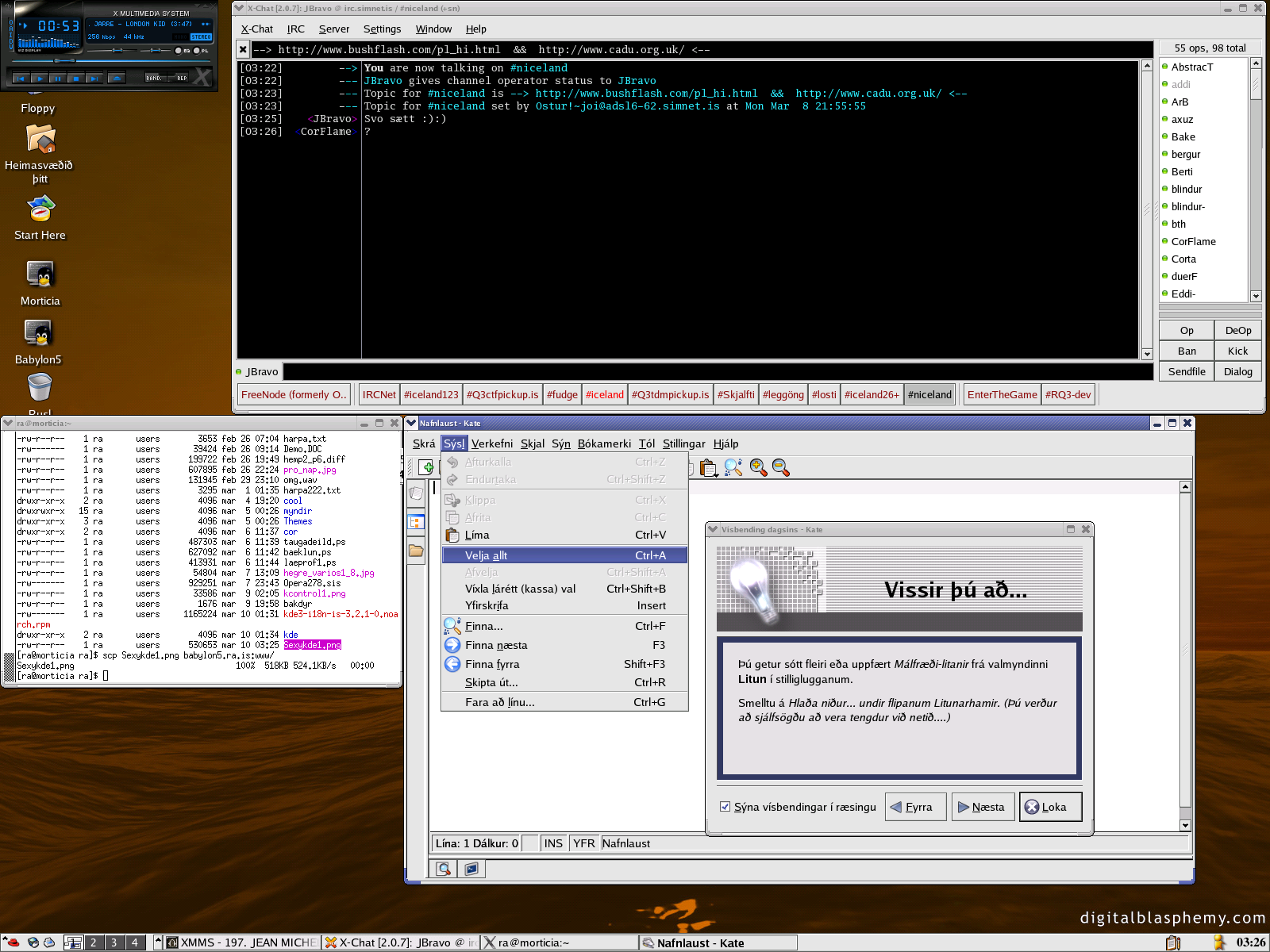 S�lir listamenn :) ��kk s� FEIKNALEGU �taki �rf�rra listamanna er �slenskan komin aftur � KDE 3.2.1. Og �a� er tilfinning m�n a� engin �tg�fa af KDE hefur veri� svona flott ��dd fyrr :)