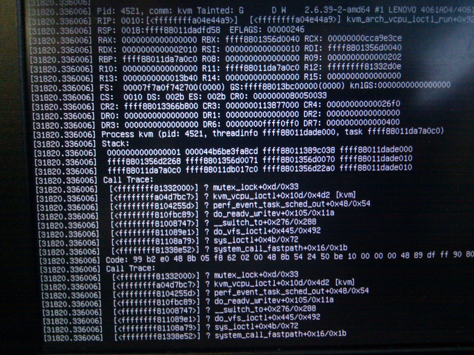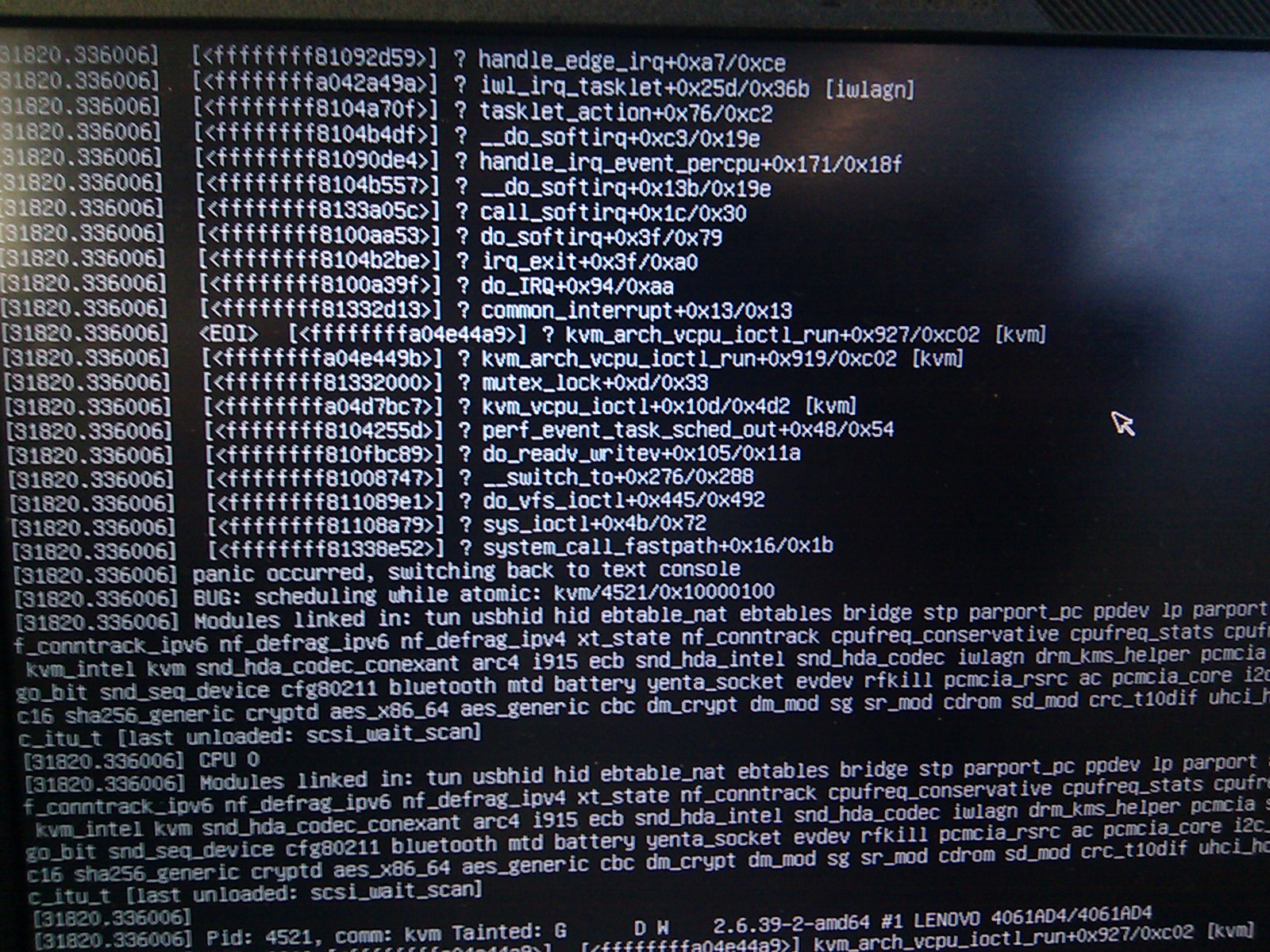 http://vmsplice.net/~stefan/panic1.jpg http://vmsplice.net/~stefan/panic2.jpg It looks like the iwlagn driver may have crashed in an interrupt handler and the kvm-related panic was triggered in the aftermath. Any ideas? This is Debian unstable linux-image-2.6.39-2-amd64, not linux-2.6.git. Perhaps this is a known issue that has been fixed? Thanks, Stefan -- To unsubscribe from this list: send the line "unsubscribe kvm" in the body of a message to [email protected] More majordomo info at http://vger.kernel.org/majordomo-info.html