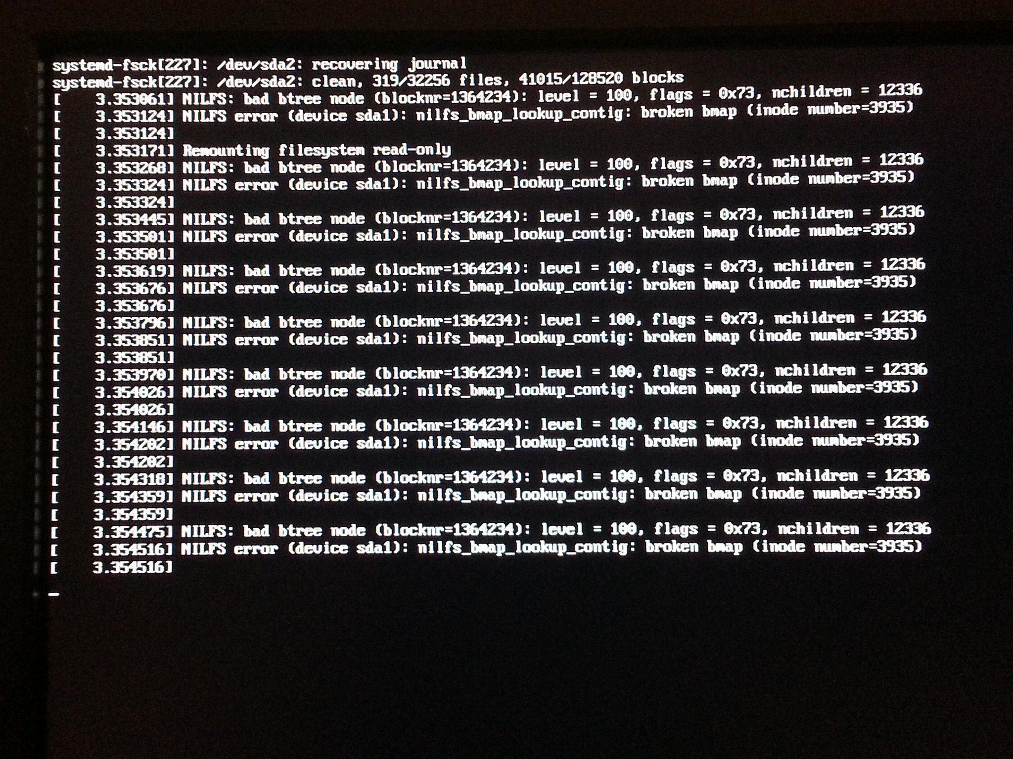 On Dec 7, 2013, at 5:17 AM, Jon Watte wrote: [snip] > However, yesterday when booting up agian, it refused to mount the root > disk, and booting was halted, with the messages shown in the below > photograph. Note that, because I can't boot, I can't get this output > in a copy-and-paste-able form! > > https://pbs.twimg.com/media/BaxOmptCYAABQuW.jpg:large > > The two repeated messages are (typed in from the photo): > NILFS: bad bree node (blocknr=1364234) ; level = 100; flags = 0x73; > nchildren = 12336 > NILFS error (device sda1): nilfs_bmap_lookup_contig: broken bmap > (inode number=3935)