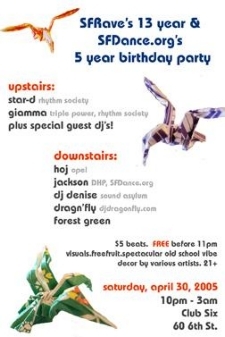 Hi all, Tomorrow (Saturday the 30th) I have 2 gigs, this is the first one I'll be at. I'm honored to play at this cuz these 2 organizations have so much history in the SF club/rave culture. So, yay! I play from 11-12. Check it out, more info on my other gig to come. ----------------- SFRaves 13 Year and SFDance.org 5 Year Birthday Party Downstairs: Hoj: Opel Jackson: DHP, SFDance.org DJ Denise: djdenise.com Dragn'fly: djdragnfly.com Forest Green Upstairs: Star-D: Rhythm Society Giamma: Triple Power, Rhythm Society Plus special guest Djs! $5 Beats. FREE before 11pm. Visuals, free fruit, spectacular old school vibe. Decor by various artists. 21+ 10pm to 3am Club Six 60 6th st. SF more info: www.sfdance.org or www.sfraves.org flyer: http://www.sfraves.org/flyers/april30_sm.jpg // DJ Denise // Mizumo Music // P.O. Box 20771 // Oakland, CA 94620 USA // // http://www.djdenise.com ==================================== Coming Summer 2005: Hard Dance Sessions V.2 - A 2-disc Tripoli Trax/Flashpoint Recods compilation mixed by Marc Johnson & DJ Denise Now Available: Hard Dance Sessions V.1 - A 2-disc Tripoli Trax/Y2K compilation mixed by Steve Hill and DJ Denise ___________________________________________________________________ The DJ Denise mailing list http://www.djdenise.com/