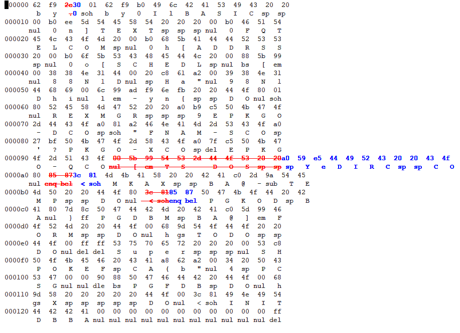 Shortly after my last message the two files got swapped again and this time I made a copy of the directory structure using "savem". It took a few days but the files eventually came back to their original position and I saved again the directory structure so I could compare them. Here is the diff : http://pics.lefauve.org/M100-Directory-diff.png We can see that: - an empty file slot (file type = 0x00, used to be "TS-DOS") became "DIRC.CO" which is the file containing the corrupted directory, so that's normal - both MKAX.BA and PGKOD.BA entries actually exchange their address and nothing else (0x813c and 0x8785) So that's weird... Also I'm not 100% sure but I think I may have read somewhere that the REXMGR should be the first file entry in the list after the builtin ones (basic, text, telcom, addrss and schedl) and in my case. I cannot find this again and I may be mistaken but it seems there are two hidden files (types 0x88 and 0xc8) and a deleted file/unused slot (type=0x00) before the REXMGR entry. Could this be the issue ? John R. Hogerhuis wrote: > More likely you loaded a corrupted file I didn't load any file into this REX bank but I didn't find an easy way to create a new empty bank with REX... So basically when I want to create a new empty bank I duplicate an entry without too many files and I delete them one by one. Could this be the reason I ended up with a corrupt structure ? (and those two hidden files?) Is there a better way to do that? At some point I emptied a bank image, and duplicated it with the name "EMPTY" trying to use it as a startup empty image but I got some issues so I stopped doing it. Also I'm not sure if it's related but when I make a backup in the REX bank (using Ctrl+B from the menu) I got two progression bars: one which says "copying RAM to image" and just after it's completed a second one without text. On most (but not all) of my other banks the second progress bar doesn't happen when I refresh the backup). I'm not sure there is a solution to the problem, so perhaps I'll try to backup/restore using mcomm or the REX bank as soon as I know what is the best way to get a new "factory empty" REX bank. I'd still like to understand what happened, though :o) Eric