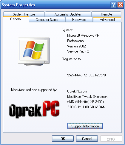contoh: http://i66.photobucket.com/albums/h252/oprekpc/balthaZor/OprekPC_OEM.png 1. Siapain gambar dgn nama file oemlogo.bmp - ukuran = 180x114 pixels, kalo lebih ntar otomatis di-stretch. - kedalaman warna bebas, tp kalo pengin latarnya jadi transparan harus 256 colors. 2. Kalo pengin nambahin info Manufactured.. & Support Information ketik di Notepad dgn format spt ini: [General] Manufacturer=OprekPC.com Model=Modifikasi-Tweak-Overclock [Support Information] Line1=http://www.oprekpc.com/ Line2= Line3= Line4= Line5= lalu save dgn nama file oeminfo.ini 3. Kopi kedua file tersebut ke .\WINDOWS\system32 4. Kalo pengin ganti data Registered to: run regedit, lalu ubah data dari string: HKEY_LOCAL_MACHINE\SOFTWARE\Microsoft\Windows NT\CurrentVersion RegisteredOwner= RegisteredOrganization= -- cheers ;)) balthazor[at]oprekpc.com http://www.oprekpc.com/forum/login.php ||||||||||||||||||||||||original message|||||||||||||||||||||||||> Sunday, November 5, 2006, 10:51:54 AM, "Toni Sepryady" <[EMAIL PROTECTED]> wrote: > Saya mau tanya bagaimana cara menampilkan gambar Manufacturer and > supported by pada System Properties seperti buatan virus codex? Send instant messages to your online friends http://asia.messenger.yahoo.com Yahoo! Groups Links <*> To visit your group on the web, go to: http://groups.yahoo.com/group/mailplus/ <*> Your email settings: Individual Email | Traditional <*> To change settings online go to: http://groups.yahoo.com/group/mailplus/join (Yahoo! ID required) <*> To change settings via email: mailto:[EMAIL PROTECTED] mailto:[EMAIL PROTECTED] <*> To unsubscribe from this group, send an email to: [EMAIL PROTECTED] <*> Your use of Yahoo! Groups is subject to: http://docs.yahoo.com/info/terms/