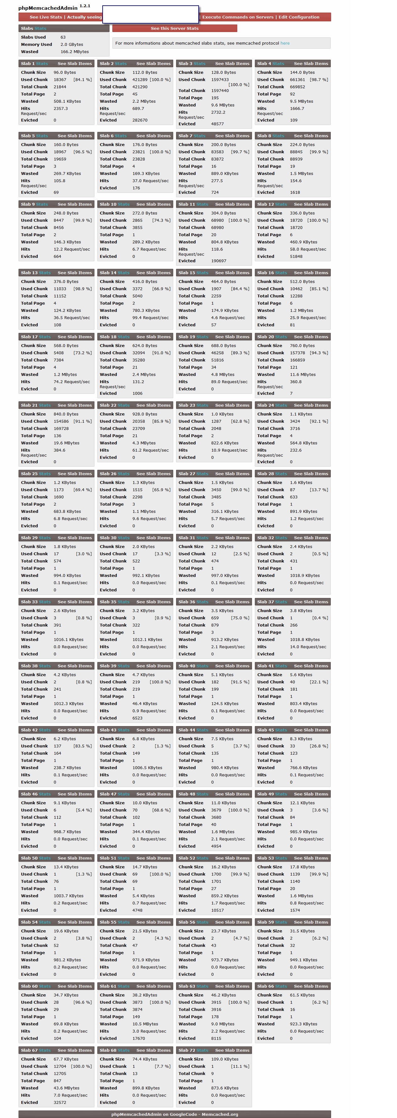 yes. > So you're saying if i set some item X, to evict it - i'd need to write AT > LEAST as many new items as as X's slab contains, because item will be > added on head, and you're removing from tail, right? yes. It's actually worse than that, since deleting items or fetching expired ones will make extra room, slowing it down. > Sending some slab stats, and TTL left for slab 1 where there are no evictions > + slab 2 where there is plenty. Unfortunately i can't send dumps as > these contain some sensitive data. > http://img.liczniki.org/20140414/slabs_all_918-1397431358.png Can you *please* sent a text dump of stats items and stats slabs? Just grep out or censor what you don't want to share? Doing math against a picture is a huge annoyance. It's also missing important counters I'd like to look at. > For ratio of long/short hard to tell... but most are definitely short. > > >Slab class 3 has 1875968 total chunks in your example, which means in > >order to cause a 120s item to evict early you need to insert into *that > >slab class* at a rate of 15,000 items per second, unless it's a multi-hour > >item instead. In which case what you said is happening but reversed: lots > >of junk 120s items are causing 5hr items to evict, but after many minutes > >and definitely not mere seconds. > > Yes but as you can see this class only contains 15% of valid data and have > plenty of evictions. The next class contains 7% valid data, but still > have 4 evictions. Probably would be best just to keep TTLs same for all > data... Your main complaint has been that 120s values don't persist for more than 60s, there's a 0% chance of any items in slab class 3 having a TTL of 120s. If you kept the TTL's all the same, what would they be? If they were all 120s and you rebalanced slabs, you'd probably never have a problem (but it seemed like you needed some data for longer). > > > > > > > > > W dniu niedziela, 13 kwietnia 2014 21:12:43 UTC+2 użytkownik Dormando napisał: > > Hey Dormando... > > > > Some quick question first... i have checked some Intel papers on > their memcached fork and for 1.6 it seems that there's some rather > big lock > > contention... have you thought about just "gluing" individual items > to a thread, using maybe item hash or some configurable method... > this way 2 > > threads won't be able to access same item at one time. I'm wondering > what whould be problems with such approach because it seems > rational at first > > glance, instead of locking the whole cache... im just curious. Is > there some release plan for 1.6... i think 2-3 years ago it was in > > developement... you're getting closer to releasing it? > > 1.4 tree has much less lock contention than 1.6. I made repeated calls > for > people to help pull bugs out of 1.6 and was ignored, so I ended up > continuing development against 1.4... There's no whole-cache lock in > 1.4, > there's a whole-LRU lock but the operations are a lot shorter. It's much > much faster than the older code. > > > Im not ignoring your posts, actually i read them but didn't want that > my posts were too large. Actually we tried using several other > things beside > > memcached. After switching from mysql with some memory tables to > memcached ~2 years ago measured throughput went from 40-50 req/s to > about 4000 > > r/s. Back then it was fine, then when traffic went higher the cache > was no longer able to evict items almost at all. > > > > Changing infrastructure in project that was in developement for over > 2 years is not easy thing. We also tested some other things like > mongodb, > > redis back then... and we just CAN'T have this data to be hitting > disks. Maybe now there are more options, but we are already > considering golang or > > C rewrite for this part... we don't want to switch to some other > "shared memory"-ish system, just be able to access data directly > between calls and > > do locking ourselves. > > > > So, again, as for current solution, decisions about what tools we use > were made a very long time ago, and are not easy to change now. > > > > >Almost instant evictions; so an item is stored, into a 16GB > instance, and < 120 seconds later is bumped out of the LRU? > > > > Yes, the items we insert for TTL=120 to 500s are not able to hold in > cache even for 60s, when we start to read/aggregate them, and > are thrown away > > instead of garbage. I understand why is that... > > S - short TTL > > L - long TTL > > SSSSSSSLSSS -> when we insert L item, no S items before L will be > able to get reclaimed, with current algo, ever. Because new L > items, will appear > > later too... for LRU to work optimially under high loads, every item > should have nearly the same TTL in given slab. You could try to > reclaim from > > top and bottom but this way one "hold forever" item would break the > whole thing as soon as it't get to top. > > I understand this part, I just find it suspicious. > > > Longest items in pool are set for 5-6h. And unfortunately item size > is no way correlated to TTL. We eg. store UA analyze and geo data > for 5h. These > > items are very short, as short as eg. impression counters. > > Ok. Any idea what the ratio to long to short is? like 10% 120s, 90% 5h, > or > reverse or whatever? > > > >You'll probably just ignore me again, but isn't this just slab > imbalance? > > No it isn't... how in hell can slab imbalance happen over just 1h, > without code changes ;) > > I can make slab imbalance happen in under 10 seconds. Not really the > point: Slab pages are pulled from the global pool as-needed as memory > fills. If your traffic has ebbs and flows, or tends to set a lot more > items in one class than others it will immediately fill and others will > starve. > > > >A better way to do this is to bucket the memory by TTL. You have > lots of > > >pretty decent options for this (and someone else already suggested > one) > > Sure, if we knew back then we'd just create 3-4 memcached instances, > add some API and shard the items based o