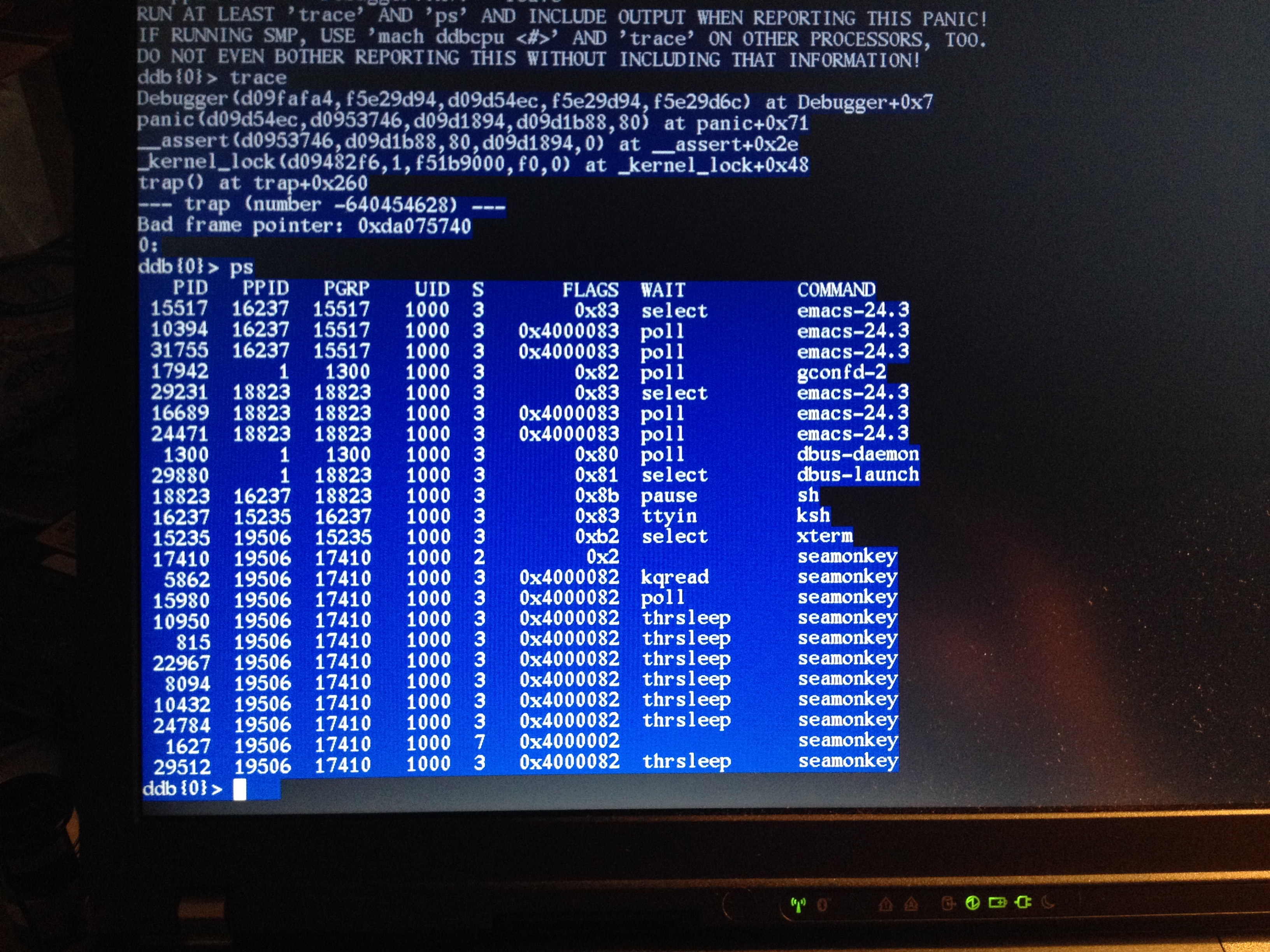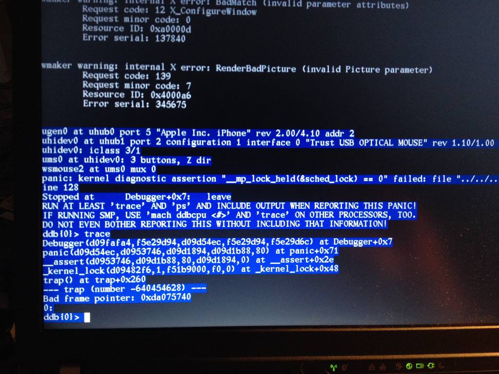 panic: kernel diagnostic asserion "__mp_lock_held(&sched_lock) == 0"