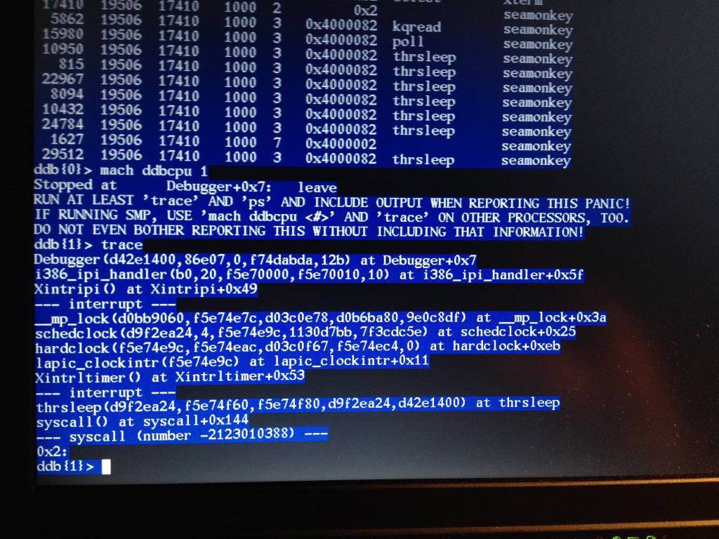 Traces on cpu0 just shows a kernel lock and trap with the panic call