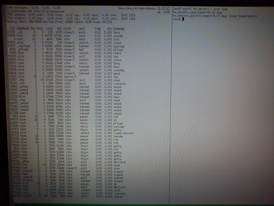 CPU: 100% idle load averages: 0.04, 0.06, 0.04 $ sysctl hw.sensors | grep temp hw.sensors.cpu0.temp0=95.00 degC hw.sensors.acpitz0.temp0=79.00 degC (zone temperature) and growed by 1 degC in 3 minutes of inactivity. Found: https://www.reddit.com/r/openbsd/comments/gmmh98/has_high_cpuheat_issue_been_fixed_in_67/ which has also this link: https://old.reddit.com/r/openbsd/comments/e6qf3m/66_t420_heat/ but: 1. no solution there; 2. there temperature average is higher by a few degC, or rises inadequately under some particular load, mine - is constantly inadequate under no load. Also, it takes several seconds for xterm to redraw itself from top to bottom on my 1280x800 display. Is it because of NVIDIA graphics? Has it something to do with high temperature? I have not tried OpenBSD/6.5 mentioned in the above links - I am a new-comer. I have not syspatch'ed - I am afraid of keeping my machine running at a-little-below-water-boiling temperature. Anyway, both https://www.openbsd.org/errata67.html https://www.openbsd.org/plus.html seem to me to not contain temperature fixes. screenshot of hot while idle: https://i.postimg.cc/9fj29RHN/IMG-20200810-212534.jpg https://i.postimg.cc/2698nkwb/IMG-20200810-212848.jpg screenshots of dmesg: https://i.postimg.cc/sD7GCWmT/IMG-20200810-212954.jpg https://i.postimg.cc/kGRYwsxN/IMG-20200810-213019.jpg https://i.postimg.cc/zG3BXRFm/IMG-20200810-213036.jpg dmesg from Linux live usb: https://hastebin.com/raw/evokawoxuz Any hints?