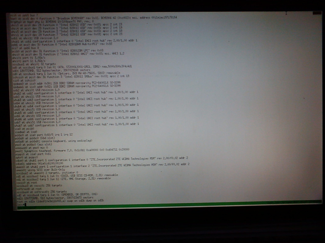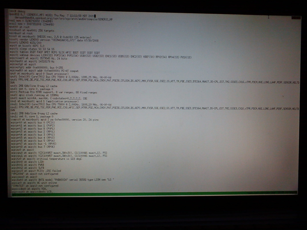 Fresh install of OpenBSD/6.7/amd64/install67.fs on Lenovo 3000 G530 laptop, 2008 manufacture year. Straight from the start, just after log in: