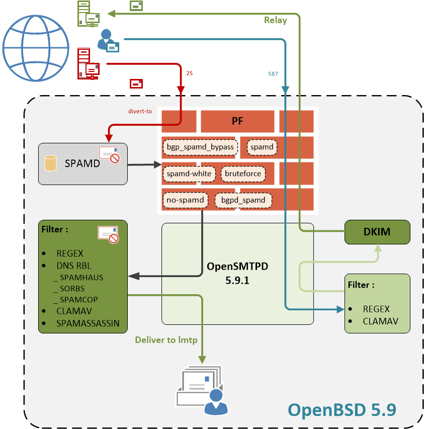 Hello Mik J. egress is the routed interface. If i understood your case you have to : _ configure PF (with divert-to) for your specifics requirements _ configure opensmtpd to define your policies. (you can also use specific tag and redirection for it) I added in attachment an overview of my implementation of opensmtpd + spamd + clamav & spamassassin (via filter) + bgpd + ... And sorry i am not a designer, the picture reflects only my understanding. I guess i did not error. > Hello, > I would like to have two different policies for clients (MUA) that send > mails.- Clients (applications) that send mails without authentication, they > have a specific IP address > - Clients (users) that send mails with an authentication, I don't know their > IP address > For case 1, it workslisten on 10.1.1.1 > accept from source <clients> for any relay > For case 2, there are examples in the man (I know that authenticated users > are considered local) depends if they are defined as virtual or not. However for my point of view an user has to be provides always an authentication. For my point of view, MTA has to knocks on the door and has to try in first to open a TLS exchange. > listen on egress tls pki mail.example.com authaccept for any relay if you perform netstat -na -f inet you will see that you request to opensmtpd to listen on a specific port. For example : ################################################### # ## Deliver : treatment depends from the flow (&port) # # Manage flow listen on lo0 port 10030 tag DKIM_OUT # outgoing email to another MTA # # Inbound listen on lo0 port 25 filter sub listen on egress port 25 filter all hostname daenerys.burelli.fr tls pki daenerys.burelli.fr auth-optional <passwd> listen on egress port 587 filter sub hostname daenerys.burelli.fr tls-require pki daenerys.burelli.fr auth <passwd> netstat -na -f inet : tcp 0 0 127.0.0.1.10030 *.* LISTEN tcp 0 0 127.0.0.1.25 *.* LISTEN tcp 0 0 95.130.9.14.25 *.* LISTEN tcp 0 0 95.130.9.14.587 *.* LISTEN tcp 0 0 127.0.0.1.10029 *.* LISTEN tcp 0 0 127.0.0.1.783 *.* LISTEN tcp 0 0 127.0.0.1.8026 *.* LISTEN tcp 0 0 127.0.0.1.8025 *.* LISTEN You have also to indicate the flow with. ################################################### # ## Allow to deliver # accept from any for domain <vdomains> virtual <valiases> deliver to lmtp "/var/dovecot/lmtp" rcpt-to # deliver via lmtp accept for local alias <aliases> deliver to mbox ################################################### # ## Relay # # Tagged mail returned from DKIM accept tagged DKIM_OUT for any relay # # Start here (inbound) accept from local for any relay via smtp://127.0.0.1:10029 # to DKIM_OUT > I don't understand fully the linelisten on egress tls pki mail.example.com > authbecause in the man page, the egress word is not definedOpenBSD manual > pagesTo what correspond the egress word ? > Regarding case 1 + case 2 I'm afraid there could be a conflict between listen > on 10.1.1.1 and listen on egress... > Do you have any idea on how to reach this ? > -- regards, Olivier