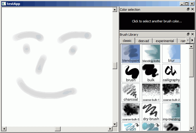 Hi, I wrote this basic demo of libMyPaint as a small mini project (using Qt 4.8). It is far from being complete but I think it is a good start... I obviously need some help to improve it and make it useful for other guys like me who would like to use libMyPaint in their application... (Qt code is very simple, so it could be easily ported to other toolkits)