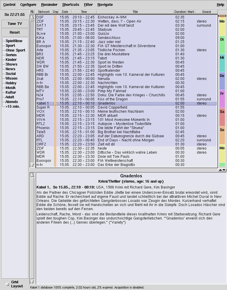 This is how nxtvepg looks like when we don't start it as a daemon or just export the xml file. http://www.schugy.de/forenlinks/mythtv/nxtvepg.jpg And this is a xml file: www.schugy.de/forenlinks/mythtv/kabel1/epgkabel1-17052005-0027.xmltv.gz