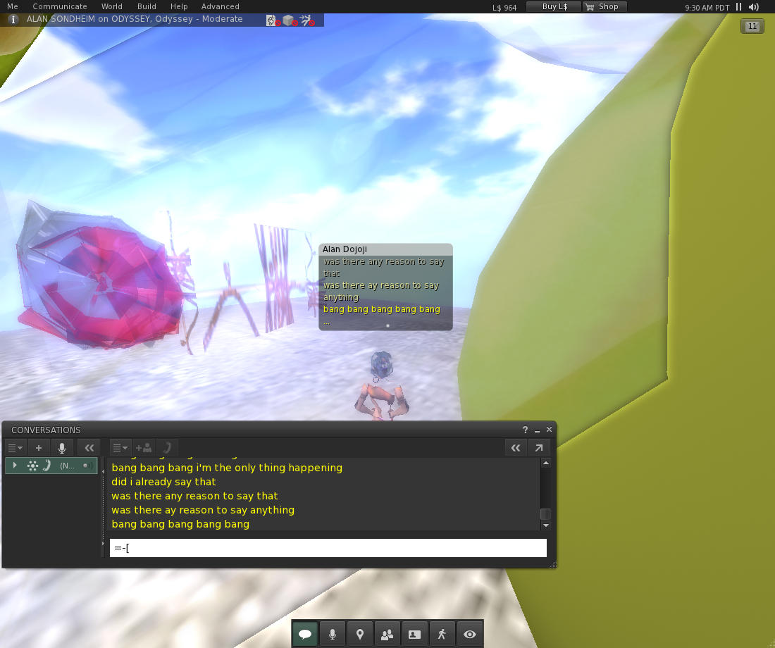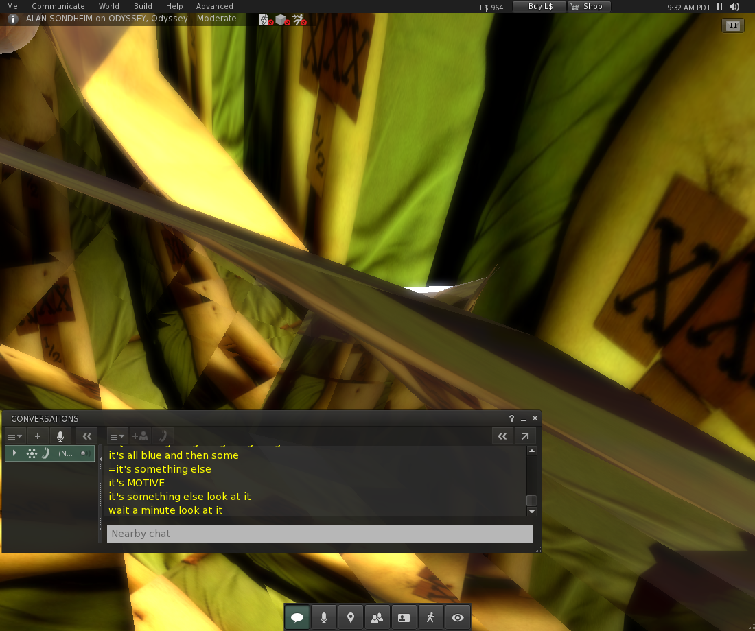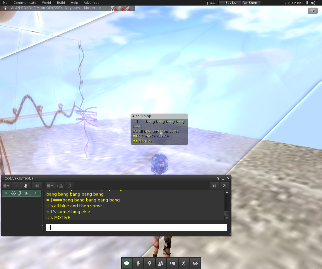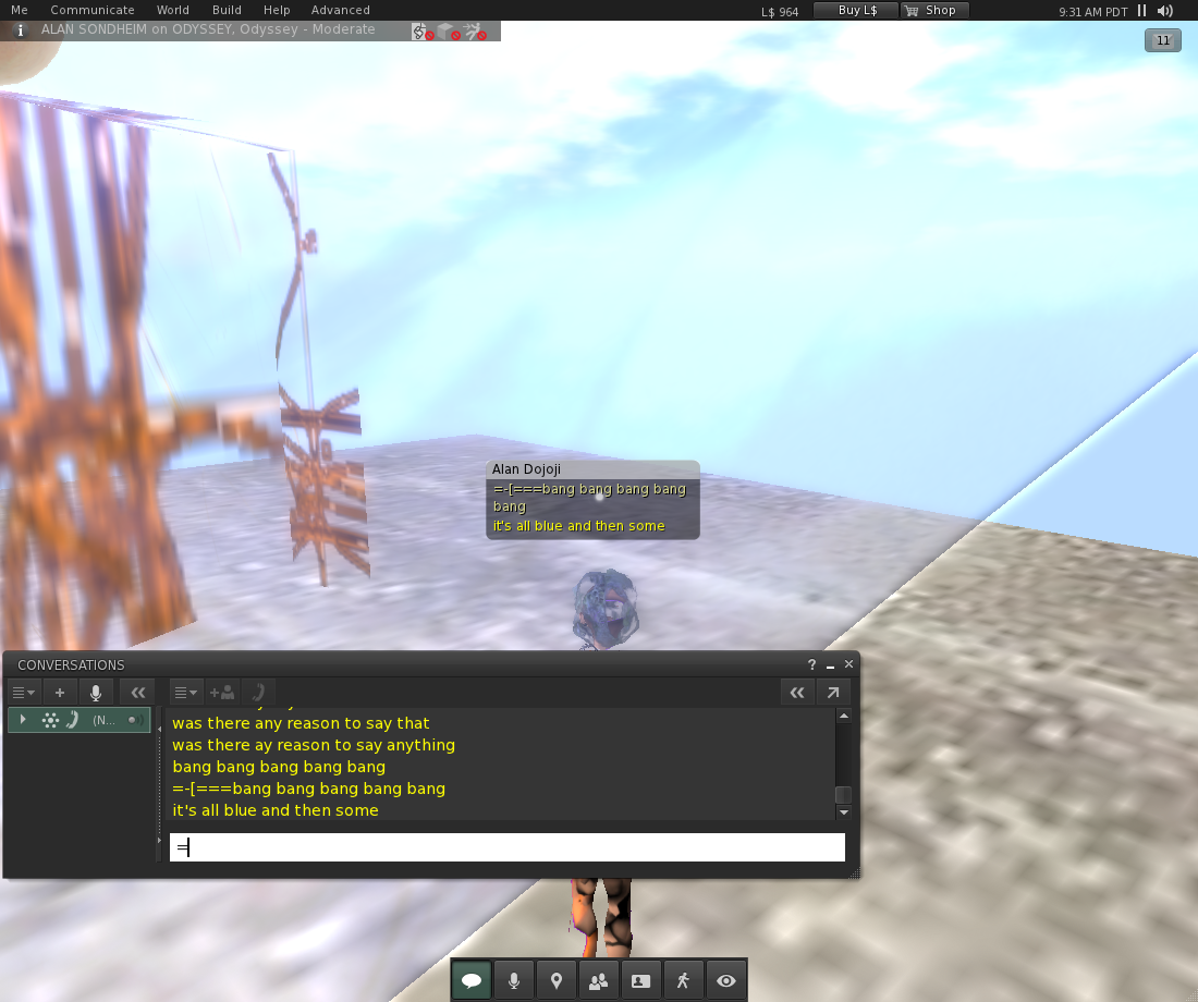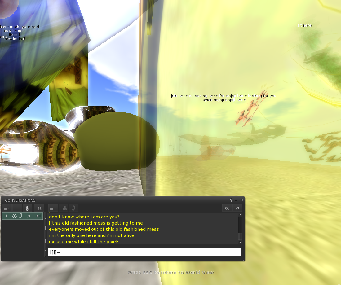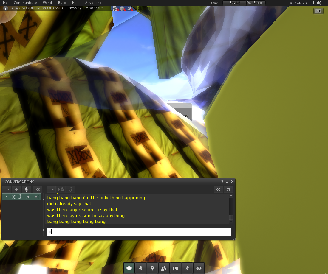 Defugefugue http://www.alansondheim.org/defugefugue1.jpg http://www.alansondheim.org/defugefugue.mp4 */2007 text/* http://www.alansondheim.org/defuge.txt */2016 text/* http://www.alansondheim.org/defuguefugue.txt virtual worlds, the deadly pate, defuge, defuguefugue: [// :] #Firestorm LSL Bridge v.: [// :] Alan Dojoji: problems using this old fashioned mess [// :] Alan Dojoji: don't know where i am are you? [// :] Alan Dojoji: [[this old fashioned mess is getting to me [// :] Alan Dojoji: everyone's moved out of this old fashioned mess http://www.alansondheim.org/defugefugue2.jpg [// :] Alan Dojoji: i'm the only one here and i'm not alive [// :] Alan Dojoji: excuse me while i kill the pixels http://www.alansondheim.org/defugefugue3.jpg [// :] Alan Dojoji: []]]=== [// :] Alan Dojoji: bang bang bang while i get out of here http://www.alansondheim.org/defugefugue4.jpg [// :] Alan Dojoji: bang bang bang i'm the only thing happening [// :] Alan Dojoji: did i already say that http://www.alansondheim.org/defugefugue5.jpg [// :] Alan Dojoji: was there any reason to say that [// :] Alan Dojoji: was there ay reason to say anything http://www.alansondheim.org/defugefugue6.jpg [// :] Alan Dojoji: bang bang bang bang bang [// :] Alan Dojoji: =-[===bang bang bang bang bang [// :] Alan Dojoji: it's all blue and then some [// :] Alan Dojoji: =it's something else http://www.alansondheim.org/defugefugue7.jpg [// :] Alan Dojoji: it's MOTIVE [// :] Alan Dojoji: it's something else look at it [// :] Alan Dojoji: wait a minute look at it [// :] Alan Dojoji: no end to it [// :] Alan Dojoji: look at it http://www.alansondheim.org/defugefugue8.jpg [// :] Alan Dojoji: no end to it [// :] Alan Dojoji: look at it [// :] Alan Dojoji: no end [// :] Alan Dojoji: none at all [// :] Flight Band: All Go [// :] Flight Band: All Stop [// :] Flight Band: All Go [// :] Flight Band: All Stop http://www.alansondheim.org/defugefugue9.jpg [// :] Flight Band: All Go [// :] Flight Band: All Stop [// :] Flight Band: All Go [// :] Flight Band: All Stop */2016 text/* http://www.alansondheim.org/defuguefugue.txt _______________________________________________ NetBehaviour mailing list [email protected] http://www.netbehaviour.org/mailman/listinfo/netbehaviour