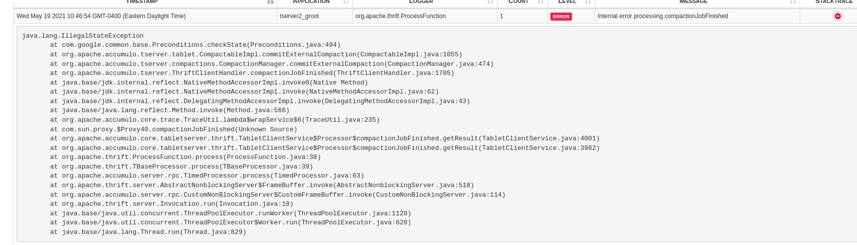During one of my basic runs testing this code (two servers, no agitation) I ran into an error in the logs. I did not notice any other issue though and I am not sure if this even interrupted anything. Screen shot below:  <details> ``` java.lang.IllegalStateException at com.google.common.base.Preconditions.checkState(Preconditions.java:494) at org.apache.accumulo.tserver.tablet.CompactableImpl.commitExternalCompaction(CompactableImpl.java:1055) at org.apache.accumulo.tserver.compactions.CompactionManager.commitExternalCompaction(CompactionManager.java:474) at org.apache.accumulo.tserver.ThriftClientHandler.compactionJobFinished(ThriftClientHandler.java:1705) at java.base/jdk.internal.reflect.NativeMethodAccessorImpl.invoke0(Native Method) at java.base/jdk.internal.reflect.NativeMethodAccessorImpl.invoke(NativeMethodAccessorImpl.java:62) at java.base/jdk.internal.reflect.DelegatingMethodAccessorImpl.invoke(DelegatingMethodAccessorImpl.java:43) at java.base/java.lang.reflect.Method.invoke(Method.java:566) at org.apache.accumulo.core.trace.TraceUtil.lambda$wrapService$6(TraceUtil.java:235) at com.sun.proxy.$Proxy40.compactionJobFinished(Unknown Source) at org.apache.accumulo.core.tabletserver.thrift.TabletClientService$Processor$compactionJobFinished.getResult(TabletClientService.java:4001) at org.apache.accumulo.core.tabletserver.thrift.TabletClientService$Processor$compactionJobFinished.getResult(TabletClientService.java:3982) at org.apache.thrift.ProcessFunction.process(ProcessFunction.java:38) at org.apache.thrift.TBaseProcessor.process(TBaseProcessor.java:39) at org.apache.accumulo.server.rpc.TimedProcessor.process(TimedProcessor.java:63) at org.apache.thrift.server.AbstractNonblockingServer$FrameBuffer.invoke(AbstractNonblockingServer.java:518) at org.apache.accumulo.server.rpc.CustomNonBlockingServer$CustomFrameBuffer.invoke(CustomNonBlockingServer.java:114) at org.apache.thrift.server.Invocation.run(Invocation.java:18) at java.base/java.util.concurrent.ThreadPoolExecutor.runWorker(ThreadPoolExecutor.java:1128) at java.base/java.util.concurrent.ThreadPoolExecutor$Worker.run(ThreadPoolExecutor.java:628) at java.base/java.lang.Thread.run(Thread.java:829) ``` </details> -- This is an automated message from the Apache Git Service. To respond to the message, please log on to GitHub and use the URL above to go to the specific comment. For queries about this service, please contact Infrastructure at: [email protected]