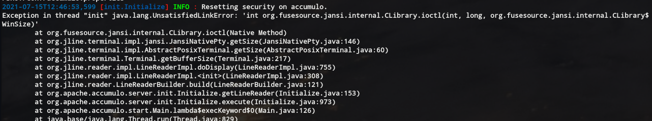 While looking at https://issues.apache.org/jira/browse/ACCUMULO-3694 and testing the 'accumulo init --reset-security' feature, I ran into an error related to jline3 and how LineReader uses a default terminal and terminal type if none is specified. A terminal object will now be created in the same way it is done in the shell. Error:  -- This is an automated message from the Apache Git Service. To respond to the message, please log on to GitHub and use the URL above to go to the specific comment. To unsubscribe, e-mail: [email protected] For queries about this service, please contact Infrastructure at: [email protected]