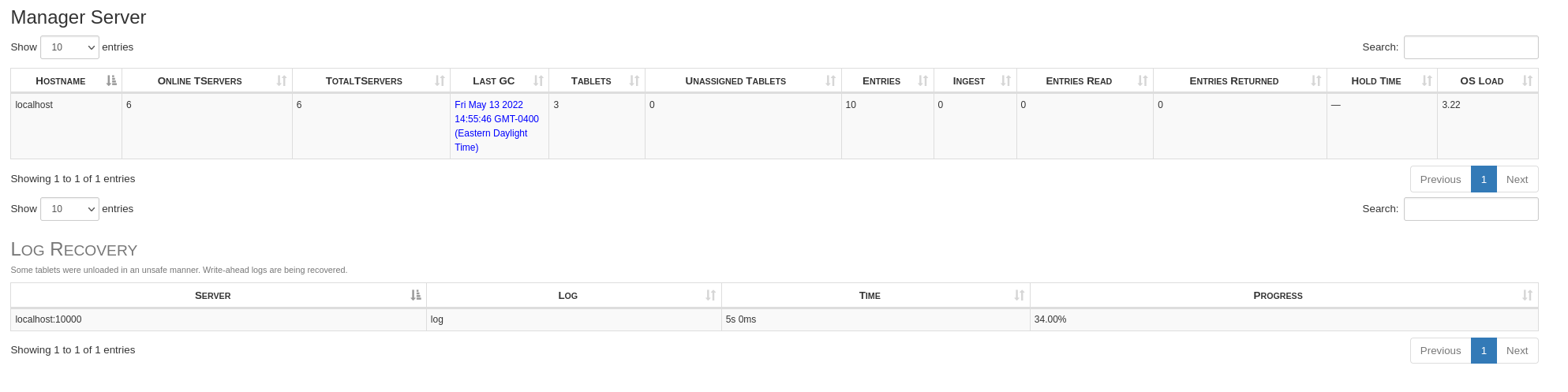 This PR moves the Manager Server table and the Log Recovery table to Datatables. Here is what the tables currently look like:  Here is what the tables look like after these changes:  There are a few minor differences but I just left everything as default for the time being. I am still working on figuring out why the autorefresh feature is not working to update these tables so will mark this as WIP until that is finished. -- This is an automated message from the Apache Git Service. To respond to the message, please log on to GitHub and use the URL above to go to the specific comment. To unsubscribe, e-mail: [email protected] For queries about this service, please contact Infrastructure at: [email protected]