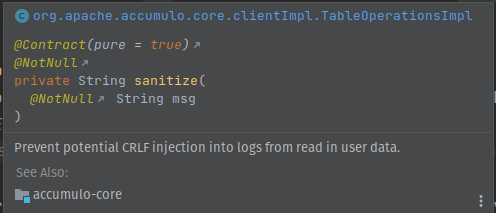 ########## core/src/main/java/org/apache/accumulo/core/clientImpl/TableOperationsImpl.java: ########## @@ -1620,8 +1620,9 @@ public void importTable(String tableName, Set<String> importDirs) } /** - * Prevent potential CRLF injection into logs from read in user data See - * https://find-sec-bugs.github.io/bugs.htm#CRLF_INJECTION_LOGS + * Prevent potential CRLF injection into logs from read in user data. + * + * @see <a href=https://find-sec-bugs.github.io/bugs.htm#CRLF_INJECTION_LOGS/> Review Comment: In my IDE, there is nothing to click to follow the here:  Maybe "CRLF injection" in the sentence could be linked or some other text to click to follow the link. -- This is an automated message from the Apache Git Service. To respond to the message, please log on to GitHub and use the URL above to go to the specific comment. To unsubscribe, e-mail: [email protected] For queries about this service, please contact Infrastructure at: [email protected]