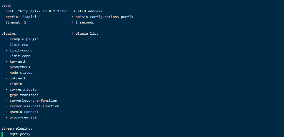 JohannT9527 edited a comment on issue #1122: can not open 9100 port when enable mqtt-proxy plugin URL: https://github.com/apache/incubator-apisix/issues/1122#issuecomment-586092734 > If you still have a problem, please provide more information. > > Your apisix version, `config.yaml` file and the operation steps. apisix version:0.8  config.yaml如图:     操作步骤: 1.先给apisix容器加了9111:9100的端口映射;  2.进入容器,修改‘conf/config.yaml’文件,去掉了stream_proxy配置的#备注; 3.restart容器,然后测试端口     容器外部 容器内部 我的操作有问题吗?