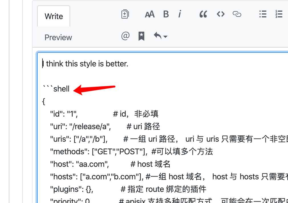 ########## File path: doc/admin-api-cn.md ########## @@ -71,7 +75,29 @@ - 除了 `uri`/`uris` 是必选的之外,`plugins`、`upstream`/`upstream_id`、`service_id` 这三类必须选择其中至少一个。 - 对于同一类参数比如 `uri`与 `uris`,`upstream` 与 `upstream_id`,`host` 与 `hosts`,`remote_addr` 与 `remote_addrs` 等,是不能同时存在,二者只能选择其一。如果同时启用,接口会报错。 -示例: +route 对象 json 配置内容: + +```json Review comment:  ---------------------------------------------------------------- This is an automated message from the Apache Git Service. To respond to the message, please log on to GitHub and use the URL above to go to the specific comment. For queries about this service, please contact Infrastructure at: [email protected] With regards, Apache Git Services