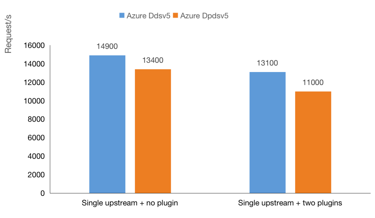 ########## blog/zh/blog/2022/08/08/apache-apisix-performance-test-in-azure.md: ########## @@ -0,0 +1,219 @@ +--- +title: "API 网关 Apache APISIX 在 Azure 的性能测试" +authors: + - name: "赵士瑞" + title: "Author" + url: "https://github.com/soulbird" + image_url: "https://github.com/soulbird.png" + - name: "韩飞" + title: "Technical Writer" + url: "https://github.com/hf400159" + image_url: "https://github.com/hf400159.png" +keywords: +- API 网关 +- Azure +- 微软 +- Apache APISIX +- 虚拟机 +description: 本文使用 API 网关 Apache APISIX 来对比 Azure Ddsv5 和 Azure Dpdsv5 在网络 IO 密集型场景下的性能。 +tags: [Ecosystem] +--- + +> 本文使用 API 网关 Apache APISIX 来对比 Azure Ddsv5 和 Azure Dpdsv5 在网络 IO 密集型场景下的性能。 + +<!--truncate--> + +## 背景 + +今年 4 月,微软宣布推出基于 Ampere® Altra® Arm 处理器的 Azure 虚拟机系列预览版。新的 VM 系列包括通用 Dpsv5 和内存优化的 Epsv5 VM,具体信息参考下图: + + + +值得注意的是,Ampere® Altra® Arm 是一款云原生处理器,基于 Ampere® Altra® Arm 处理器的 Azure 虚拟机也因此能以高效的方式运行横向扩展的云原生应用程序。 + +那么实际体验和性能如何呢?接下来我们将以一个云原生的 API 网关为例,带大家一起看看基于 ARM 架构的 Azure 虚拟机的表现。这里,我们选择了 Apache APISIX 在通用型 Dpdsv5 系列虚拟机上进行安装测试。 + +Apache APISIX 是一个云原生、高性能、可扩展的 API 网关。基于 NGNIX + LuaJIT 和 etcd,APISIX 与传统 API 网关相比,具有动态路由和插件热加载特性,特别适合云原生架构下的 API 管理。 + + + +## 前期准备 + +首先,我们在 Azure 上启动一个 Dpdsv5 系列的实例,操作系统选择 Ubuntu 20.04。 + + + +然后安装 Docker,方便后续使用容器化的方式来部署 Apache APISIX。 + +```shell +sudo apt-get update && sudo apt-get install docker.io +``` + +## 部署 Apache APISIX + +Apache APISIX 使用 etcd 作为配置中心,因此需要先启动一个 etcd 实例。 + +```shell +sudo docker run -d --name etcd \ + -p 2379:2379 \ + -e ETCD_UNSUPPORTED_ARCH=arm64 \ + -e ETCD_LISTEN_CLIENT_URLS=http://0.0.0.0:2379 \ + -e ETCD_ADVERTISE_CLIENT_URLS=http://0.0.0.0:2379 \ + rancher/coreos-etcd:v3.4.16-arm64 +``` + +启动 Apache APISIX 实例。 + +```shell +sudo docker run --net=host -d apache/apisix:2.14.1-alpine +``` + +创建路由。 + +```shell +curl "http://127.0.0.1:9080/apisix/admin/routes/1" \ +-H "X-API-KEY: edd1c9f034335f136f87ad84b625c8f1" -X PUT -d ' +{ + "uri": "/anything/*", + "upstream": { + "type": "roundrobin", + "nodes": { + "httpbin.org:80": 1 + } + } +}' +``` + +进行访问测试。 + +```shell +curl -i http://127.0.0.1:9080/anything/das +``` + +返回以下结果则表示安装成功: + +```shell +HTTP/1.1 200 OK +..... +``` + +## Azure Ddsv5 vs Azure Dpdsv5 + +从上述操作来看,Apache APISIX 在 Azure Dpdsv5 上的安装和兼容性测试都能顺利完成。那么 Azure Dpdsv5 的实际性能到底如何呢?接下来我们将使用 Apache APISIX 分别在 Azure Dpdsv5 和 Azure Ddsv5 上做性能测试对比,看看实际表现。 + +Azure Ddsv5 是 Azure D 系列的另一款机型,是基于 Intel® x86 架构的, 所以上述 etcd 安装步骤略有不同: + +```shell +sudo docker run -d --name etcd \ + -p 2379:2379 \ + -e ETCD_LISTEN_CLIENT_URLS=http://0.0.0.0:2379 \ + -e ALLOW_NONE_AUTHENTICATION=yes \ + -e ETCD_ADVERTISE_CLIENT_URLS=http://0.0.0.0:2379 \ + bitnami/etcd:3.4.16 +``` + +为简单起见,本次测试 APISIX 中只启用了一个 Worker,以下性能测试数据均在单核 CPU 上运行。 + +### 场景一:单上游 + +该场景下将使用单个上游(不包含任何插件),主要测试 APISIX 在纯代理回源模式下的性能表现。在本地环境中进行测试: + +```shell +# apisix: 1 worker + 1 upstream + no plugin + +# 注册路由 +curl http://127.0.0.1:9080/apisix/admin/routes/1 \ +-H 'X-API-KEY: edd1c9f034335f136f87ad84b625c8f1' -X PUT -d ' +{ + "uri": "/hello", + "plugins": { + }, + "upstream": { + "type": "roundrobin", + "nodes": { + "127.0.0.1:1980":1 + } + } +}' +``` + +### 场景 2:单个上游 + 两个插件 + +该场景下将使用单个上游与两个插件进行,主要测试 APISIX 在开启 `limit-count` 和 `prometheus` 两个核心性能消耗插件时的表现。 + +```shell +# apisix: 1 worker + 1 upstream + 2 plugins (limit-count + prometheus) + +# 注册路由 +curl http://127.0.0.1:9080/apisix/admin/routes/1 \ +-H 'X-API-KEY: edd1c9f034335f136f87ad84b625c8f1' -X PUT -d ' +{ + "uri": "/hello", + "plugins": { + "limit-count": { + "count": 2000000000000, + "time_window": 60, + "rejected_code": 503, + "key": "remote_addr" + }, + "prometheus": {} + }, + "upstream": { + "type": "roundrobin", + "nodes": { + "127.0.0.1:1980":1 + } + } +}' +``` + +### 数据比较 + +上述两个场景中,分别从请求 QPS(每秒查询数) 和延迟时间两个层面进行了相关的测试对比。结果如下: + +1. QPS 比较 + +  + +2. 请求延迟比较 + +  + +<table> + <tr> + <td><b> </b></td> + <td colspan="2">单个上游</td> + <td colspan="2">单个上游+两个插件</td> + </tr> + <tr> + <td><b> </b></td> + <td><b>Azure Ddsv5</b></td> + <td><b>Azure Dpdsv5</b></td> + <td><b>Azure Ddsv5</b></td> + <td><b>Azure Dpdsv5</b></td> + </tr> + <tr> + <td><b>QPS(request/s)</b></td> + <td><b>14900</b></td> + <td><b>13400</b></td> + <td><b>13100</b></td> + <td><b>11000</b></td> + </tr> + <tr> + <td><b>Latency(ms)</b></td> + <td><b>1.07</b></td> + <td><b>1.21</b></td> + <td><b>1.21</b></td> + <td><b>1.43</b></td> + </tr> + </table> + +从以上数据也可以看出,在 API 网关等网络 IO 密集计算场景下,Dpdsv5 相比同系列 Ddsv5 在性能上仍然有差距。不过另一个好消息是,在同等配置的情况下,Dpdsv5 的价格要比 Ddsv5 便宜 20% 左右。在实际机器选型时,用户可以根