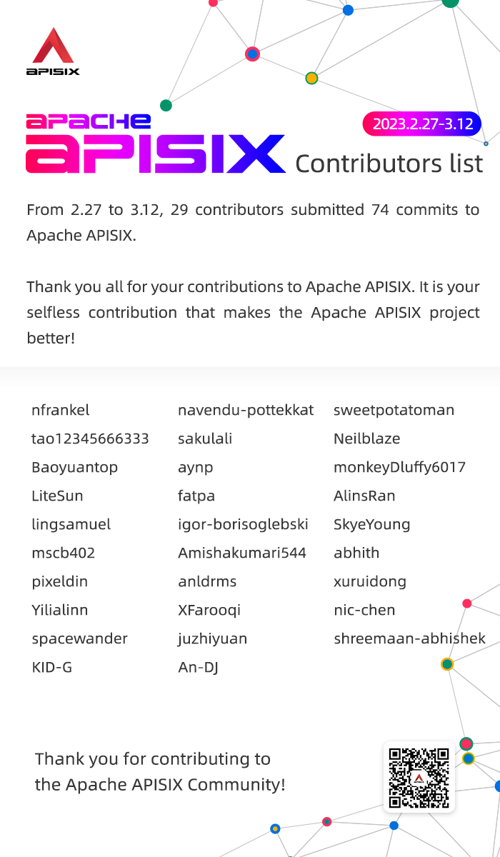 ########## blog/zh/blog/2023/03/16/weekly-report-0216.md: ########## @@ -0,0 +1,51 @@ +--- +title: "社区双周报 (2.27 - 3.12)" +keywords: +- Apache APISIX +- API 网关 +- 社区周报 +- 贡献者 +description: “独行者速,众行者远”。Apache APISIX 社区周报希望可以帮助社区小伙伴们更好地掌握 Apache APISIX 社区的进展,方便大家参与到 Apache APISIX 社区中来。 +tags: [Community] +image: https://static.apiseven.com/uploads/2023/03/14/zSVpVOqk_%E7%A4%BE%E5%8C%BA%E5%8F%8C%E5%91%A8%E6%8A%A5-%E5%A4%B4%E5%9B%BE-05%E6%9C%9F.png +--- + +> 从 2023.2.27 - 2023.3.12,有 29 位开发者为 Apache APISIX 提交了 74 个 commit。感谢这些小伙伴为 Apache APISIX 添砖加瓦,是你们的无私付出,让 Apache APISIX 项目变得更好! + +<!--truncate--> + +## 导语 + +Apache APISIX 从开源第一天就以社区方式成长,迅速成为全世界最活跃的开源 API 网关项目。这些成就,离不开社区小伙伴们的共同奋斗。 + +“独行者速,众行者远”。Apache APISIX 社区周报希望可以帮助社区小伙伴们更好地掌握 Apache APISIX 社区的进展,方便大家参与到 Apache APISIX 社区中来。 + +## 贡献者统计 + + + + + +## 近期亮点功能 + +### Apache APISIX + +- [`clickhouse-logger` 插件添加记录请求体响应体特性支持](https://github.com/apache/apisix/pull/8722)(贡献者:[pixeldin](https://github.com/pixeldin)) + +- [Cli 启动模式添加从 `APISIX_DEPLOYMENT_ETCD_HOST` 环境变量中获取 etcd 主机支持](https://github.com/apache/apisix/pull/8898)(贡献者:[An-DJ](https://github.com/An-DJ)) + +- [增加 `degraphql` 插件,允许用户通过配置将请求映射至固定的 GraphQL 查询](https://github.com/apache/apisix/pull/8959)(贡献者:[spacewander](https://github.com/spacewander)) + +### Apache APISIX Ingress Controller + +- 为 APISIX Ingress 的自定义资源增加 IngressClass 支持,允许同一集群中同时部署多套 Ingress controller 并使用自定义资源。贡献者:[AlinsRan](https://github.com/AlinsRan),[lingsamuel](https://github.com/lingsamuel),[Donghui0](https://github.com/Donghui0),相关 PR: + +- [feat: make multiple controllers handle different ApisixRoute CRDs](https://github.com/apache/apisix/pull/8696) Review Comment: ```suggestion - [feat: make multiple controllers handle different ApisixRoute CRDs](https://github.com/apache/apisix-ingress-controller/pull/593) ``` -- This is an automated message from the Apache Git Service. To respond to the message, please log on to GitHub and use the URL above to go to the specific comment. To unsubscribe, e-mail: [email protected] For queries about this service, please contact Infrastructure at: [email protected]