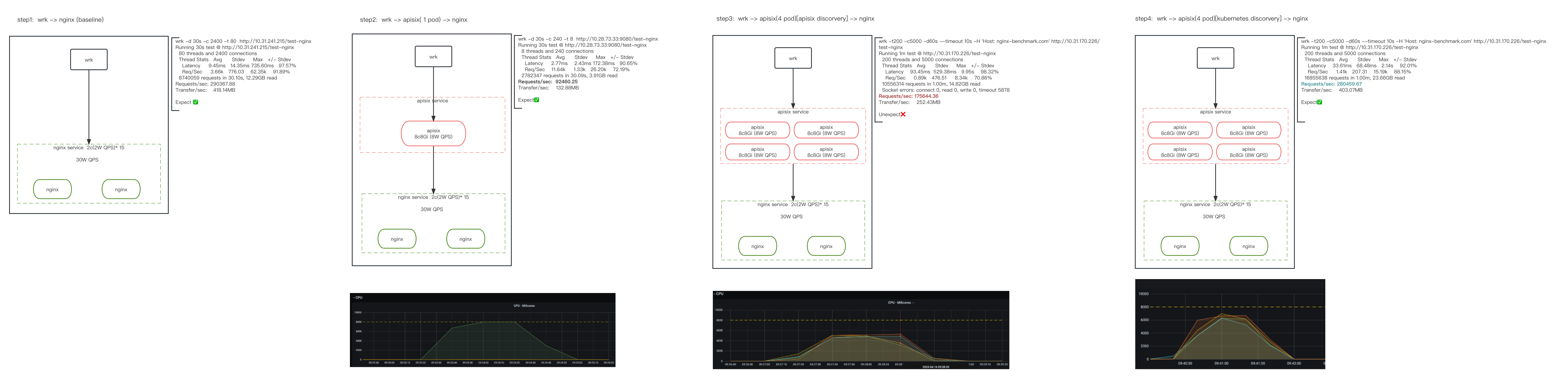 ### Description I have a high-concurrency requirement that requires apisix to support 200,000+ concurrent requests. However, in reality, when the upstream of apisix is set to "discovery_type: kubernetes", apisix becomes a performance bottleneck. On the other hand, when the upstream of apisix is set to "nodes", the performance meets expectations. Here are the steps of the experiment: - Step 1: Prepare a target service - an nginx service, use wrk to perform load testing, and verify that it can support `28W QPS `; this serves as the **baseline**. **( wrk -> nginx[15Pod] )** ✅ - Step 2: Perform load testing on 1 apisix Pod with `8C 8GB`. The result is `8W QPS` , and the CPU usage has already reached 8 cores. At this point, the bottleneck is on the single node of apisix. **( wrk -> apisix[1 Pod] -> nginx[15Pod] )** ✅ - Step 3: Scale apisix to 4 pods and perform load testing. It is expected to reach `28W QPS` , but it did not meet expectations. The test result only reached `170,000 QPS`, and CPU usage did not reach its peak. **(wrk -> apisix[4Pod][apisix discovery] -> nginx[15 Pod])** ❌ - Step 4: Modify the upstream of apisix to "**service IP**", that is, use Kubernetes service discovery. It is expected to reach 28W concurrent requests, and the result meets expectations with a test result of `28W QPS`. **(wrk -> apisix[4Pod][kubernetes discovery] -> nginx[15Pod])** ✅ The screenshot below shows the test result:  **`Why did the performance not meet expectations when using "discovery_type: kubernetes" in the upstream?`** Here's your configuration file for steps 1-3: ```yaml uri: /test-nginx host: nginx-benchmark.com upstream: timeout: connect: 50 send: 50 read: 50 type: roundrobin scheme: http discovery_type: kubernetes pass_host: pass name: nginx service_name: infrafe/devops-test-nginx:http keepalive_pool: idle_timeout: 60 requests: 100000 size: 320 status: 1 ``` And here's your configuration file for step 4: ```yaml uri: /test-nginx host: nginx-benchmark.com upstream: nodes: - host: 10.31.241.215 port: 80 weight: 1 timeout: connect: 6 send: 6 read: 6 type: roundrobin scheme: http pass_host: pass keepalive_pool: idle_timeout: 60 requests: 100000 size: 320 status: 1 ``` ### Environment - APISIX version (run `apisix version`): 2.15.0 - Operating system (run `uname -a`): Linux apisix-rta-68c56cbd58-4dbxt 5.4.119-19-0009.11 #1 SMP Wed Oct 5 18:41:07 CST 2022 x86_64 Linux - OpenResty / Nginx version (run `openresty -V` or `nginx -V`): openresty/1.21.4.1 - etcd version, if relevant (run `curl http://127.0.0.1:9090/v1/server_info`): - APISIX Dashboard version, if relevant: 2.13 - Plugin runner version, for issues related to plugin runners: - LuaRocks version, for installation issues (run `luarocks --version`): -- This is an automated message from the Apache Git Service. To respond to the message, please log on to GitHub and use the URL above to go to the specific comment. To unsubscribe, e-mail: [email protected] For queries about this service, please contact Infrastructure at: [email protected]