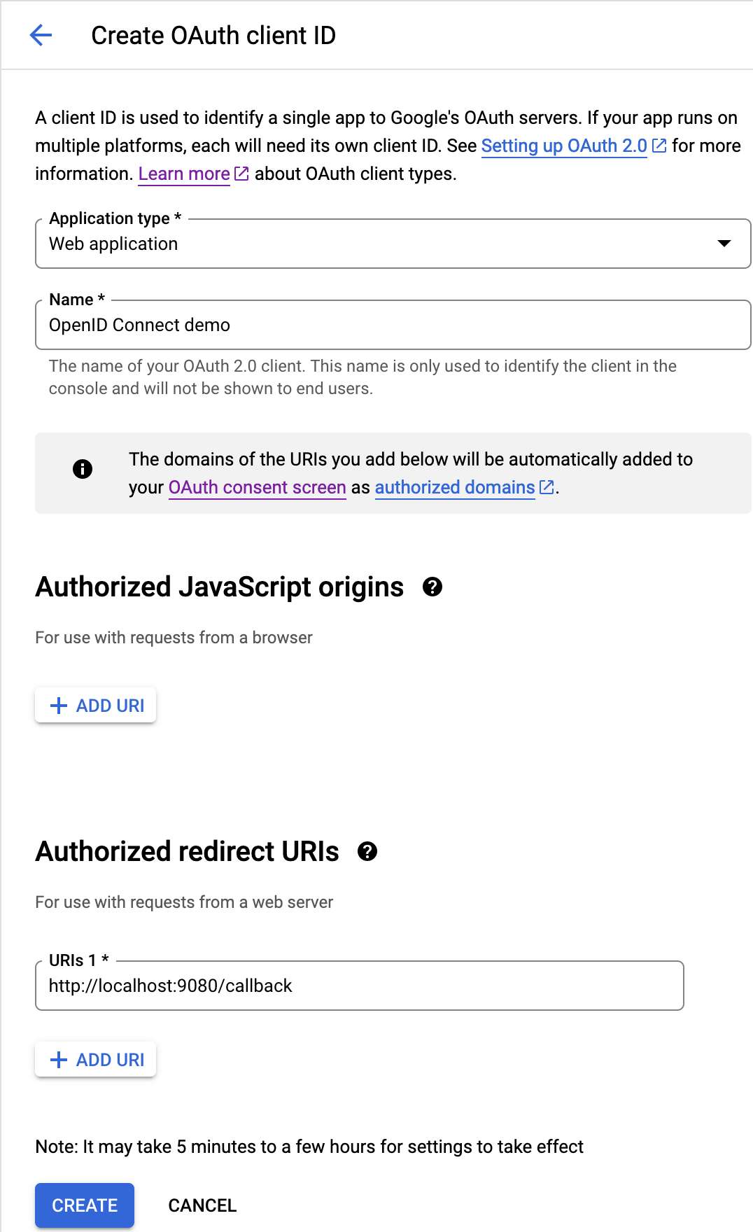 +* Authorized redirect URIs: `<URL>/callback`, _e.g._,