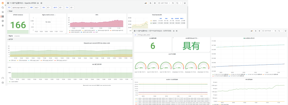 +- **Prometheus + Grafana** 是 APISIX 官方的插件,我们通过它主要监控 APISIX 网关的错误率、延迟、TPS