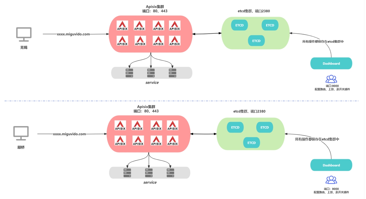 +咪咕当前的现网 APISIX 网关环境一般都为双机房架构。每个机房都有多台 APISIX 服务,一套 etcd 集群(一般是3台),以及一台