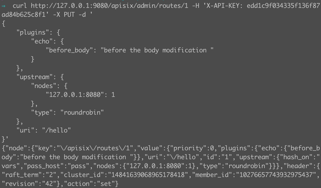 ### Issue description After adding the official echo plugin, the output content did not meet expectations.  here is route config.  ### Environment * apisix version (cmd: `apisix version`): `2.0` * OS: `mac os` ---------------------------------------------------------------- This is an automated message from the Apache Git Service. To respond to the message, please log on to GitHub and use the URL above to go to the specific comment. For queries about this service, please contact Infrastructure at: [email protected]