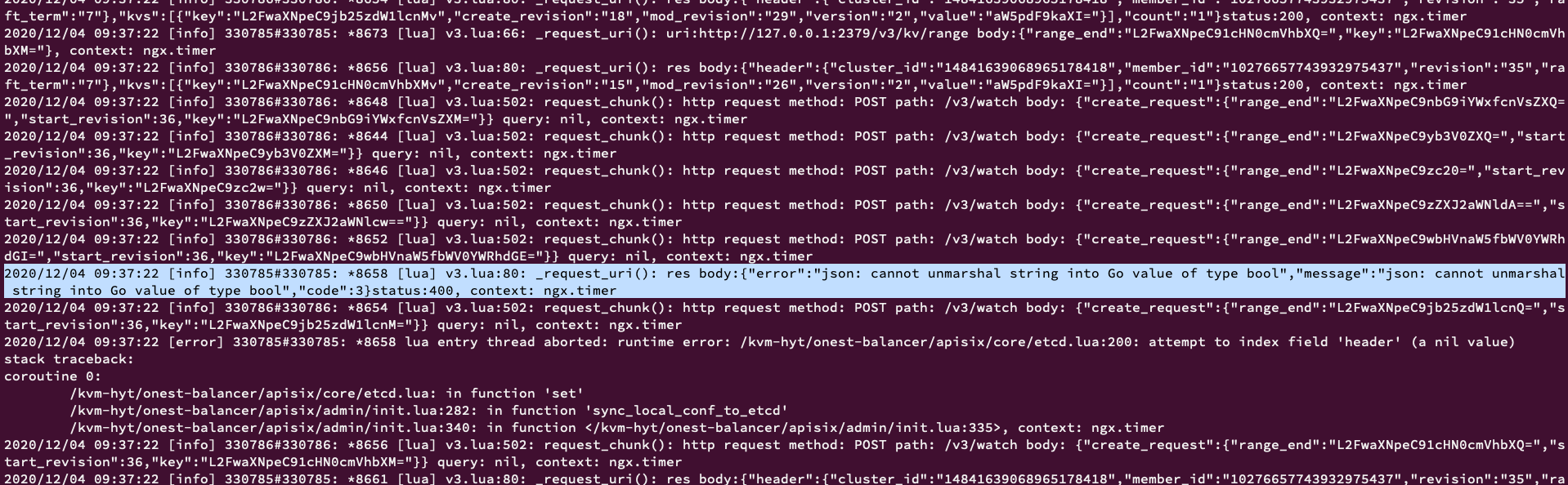 ### Issue description A runtime error occurs when starting apisix at the first time. ### Environment * apisix version (cmd: `apisix version`): 2.1 * OS: Centos 7.6 ### Minimal test code / Steps to reproduce the issue 1. Starting with a clean environment, run `make deps`, `make init`, and `make run` 2. Find an error message in `error.log` with log level `info`. ### What's the actual result? (including assertion message & call stack if applicable)  ### What's the expected result? Nothing ---------------------------------------------------------------- This is an automated message from the Apache Git Service. To respond to the message, please log on to GitHub and use the URL above to go to the specific comment. For queries about this service, please contact Infrastructure at: [email protected]