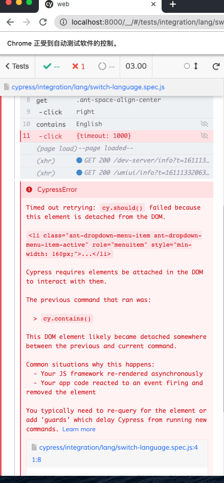 ########## File path: web/cypress/integration/lang/switch-language.spec.js ########## @@ -0,0 +1,44 @@ +/* + * Licensed to the Apache Software Foundation (ASF) under one or more + * contributor license agreements. See the NOTICE file distributed with + * this work for additional information regarding copyright ownership. + * The ASF licenses this file to You under the Apache License, Version 2.0 + * (the "License"); you may not use this file except in compliance with + * the License. You may obtain a copy of the License at + * + * http://www.apache.org/licenses/LICENSE-2.0 + * + * Unless required by applicable law or agreed to in writing, software + * distributed under the License is distributed on an "AS IS" BASIS, + * WITHOUT WARRANTIES OR CONDITIONS OF ANY KIND, either express or implied. + * See the License for the specific language governing permissions and + * limitations under the License. + */ +/* eslint-disable no-undef */ + +context('Switch language', () => { + const timeout = 1000; + const domSelector = { + switcher: '.ant-space-align-center', + }; + + beforeEach(() => { + cy.login(); + }); + + it('should switch language', () => { + cy.visit('/'); + + cy.get(domSelector.switcher).click('right'); + cy.contains('简体中文').click({ + timeout, + }); + cy.contains('服务').click(); + + cy.get(domSelector.switcher).click('right'); + cy.contains('English').click({ + timeout, + }); + cy.contains('Create'); Review comment: You cannot use .should() here, as shown in the figure:  ---------------------------------------------------------------- This is an automated message from the Apache Git Service. To respond to the message, please log on to GitHub and use the URL above to go to the specific comment. For queries about this service, please contact Infrastructure at: [email protected]