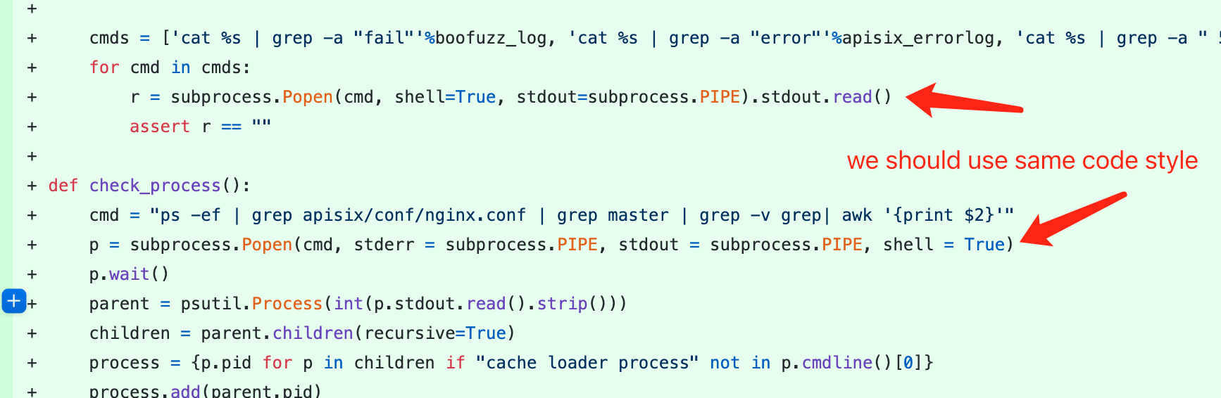 ########## File path: t/fuzzing/route_test.py ########## @@ -0,0 +1,87 @@ +# +# Licensed to the Apache Software Foundation (ASF) under one or more +# contributor license agreements. See the NOTICE file distributed with +# this work for additional information regarding copyright ownership. +# The ASF licenses this file to You under the Apache License, Version 2.0 +# (the "License"); you may not use this file except in compliance with +# the License. You may obtain a copy of the License at +# +# http://www.apache.org/licenses/LICENSE-2.0 +# +# Unless required by applicable law or agreed to in writing, software +# distributed under the License is distributed on an "AS IS" BASIS, +# WITHOUT WARRANTIES OR CONDITIONS OF ANY KIND, either express or implied. +# See the License for the specific language governing permissions and +# limitations under the License. +# + +#! /usr/bin/env python +import subprocess +from public import * +from boofuzz import * + +def create_route(): + command = '''curl http://127.0.0.1:9080/apisix/admin/routes/1 -H 'X-API-KEY: edd1c9f034335f136f87ad84b625c8f1' -X PUT -d ' +{ + "uri": "/get*", + "methods": ["GET"], + "upstream": { + "type": "roundrobin", + "nodes": { + "127.0.0.1:6666": 1 + } + } +}' + ''' + subprocess.Popen(command,stdout=subprocess.PIPE,stderr=subprocess.PIPE,shell=True) Review comment: missing space between argument items ########## File path: t/fuzzing/public.py ########## @@ -0,0 +1,44 @@ +# +# Licensed to the Apache Software Foundation (ASF) under one or more +# contributor license agreements. See the NOTICE file distributed with +# this work for additional information regarding copyright ownership. +# The ASF licenses this file to You under the Apache License, Version 2.0 +# (the "License"); you may not use this file except in compliance with +# the License. You may obtain a copy of the License at +# +# http://www.apache.org/licenses/LICENSE-2.0 +# +# Unless required by applicable law or agreed to in writing, software +# distributed under the License is distributed on an "AS IS" BASIS, +# WITHOUT WARRANTIES OR CONDITIONS OF ANY KIND, either express or implied. +# See the License for the specific language governing permissions and +# limitations under the License. +# + +#! /usr/bin/env python +import subprocess +import os +import psutil + +def cur_dir(): + return os.path.split(os.path.realpath(__file__))[0] + +def check_log(*logs): + boofuzz_log = logs[0] + apisix_errorlog = logs[1] + apisix_accesslog = logs[2] + + cmds = ['cat %s | grep -a "fail"'%boofuzz_log, 'cat %s | grep -a "error"'%apisix_errorlog, 'cat %s | grep -a " 500 "'%apisix_accesslog] + for cmd in cmds: + r = subprocess.Popen(cmd, shell=True, stdout=subprocess.PIPE).stdout.read() + assert r == "" + +def check_process(): + cmd = "ps -ef | grep apisix/conf/nginx.conf | grep master | grep -v grep| awk '{print $2}'" + p = subprocess.Popen(cmd, stderr = subprocess.PIPE, stdout = subprocess.PIPE, shell = True) Review comment:  ########## File path: t/fuzzing/route_test.py ########## @@ -0,0 +1,87 @@ +# +# Licensed to the Apache Software Foundation (ASF) under one or more +# contributor license agreements. See the NOTICE file distributed with +# this work for additional information regarding copyright ownership. +# The ASF licenses this file to You under the Apache License, Version 2.0 +# (the "License"); you may not use this file except in compliance with +# the License. You may obtain a copy of the License at +# +# http://www.apache.org/licenses/LICENSE-2.0 +# +# Unless required by applicable law or agreed to in writing, software +# distributed under the License is distributed on an "AS IS" BASIS, +# WITHOUT WARRANTIES OR CONDITIONS OF ANY KIND, either express or implied. +# See the License for the specific language governing permissions and +# limitations under the License. +# + +#! /usr/bin/env python Review comment: ditto ---------------------------------------------------------------- This is an automated message from the Apache Git Service. To respond to the message, please log on to GitHub and use the URL above to go to the specific comment. For queries about this service, please contact Infrastructure at: [email protected]