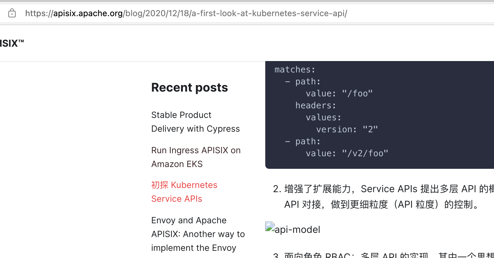 https://apisix.apache.org/blog/2020/12/18/a-first-look-at-kubernetes-service-api  ---------------------------------------------------------------- This is an automated message from the Apache Git Service. To respond to the message, please log on to GitHub and use the URL above to go to the specific comment. For queries about this service, please contact Infrastructure at: [email protected]