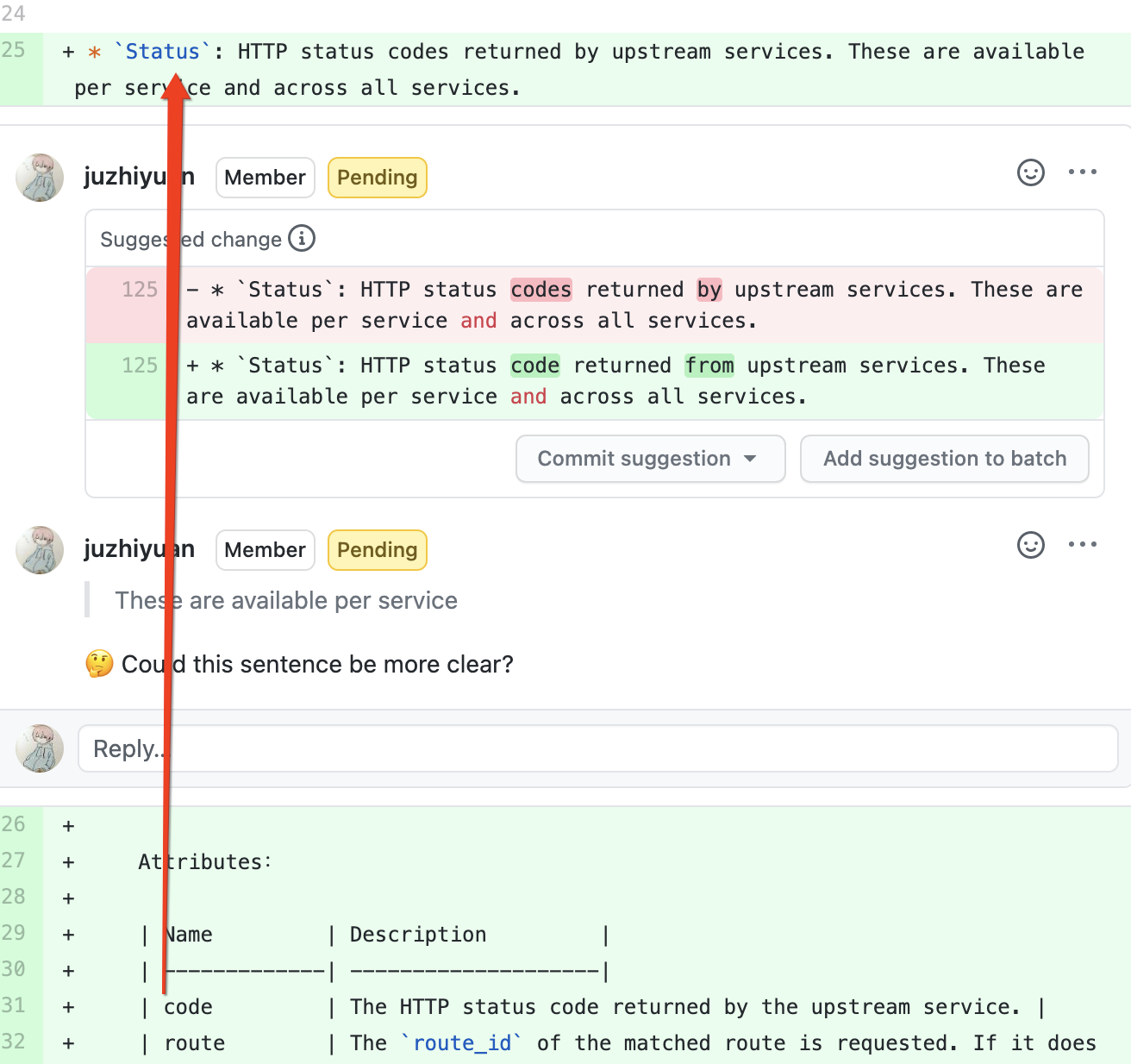 ########## File path: doc/plugins/prometheus.md ########## @@ -122,12 +122,56 @@ Or you can goto [Grafana official](https://grafana.com/grafana/dashboards/11719) ### Available metrics -* `Status codes`: HTTP status codes returned by upstream services. These are available per service and across all services. +* `Status`: HTTP status codes returned by upstream services. These are available per service and across all services. Review comment: ```suggestion * `Status`: HTTP status code returned from upstream services. These are available per service and across all services. ``` ########## File path: doc/plugins/prometheus.md ########## @@ -122,12 +122,56 @@ Or you can goto [Grafana official](https://grafana.com/grafana/dashboards/11719) ### Available metrics -* `Status codes`: HTTP status codes returned by upstream services. These are available per service and across all services. +* `Status`: HTTP status codes returned by upstream services. These are available per service and across all services. + + Attributes: + + | Name | Description | + | -------------| --------------------| + | code | The HTTP status code returned by the upstream service. | + | route | The `route_id` of the matched route is requested. If it does not match, the default value is an empty string. | Review comment: > The `route_id` of the matched route is requested requested? ########## File path: doc/plugins/prometheus.md ########## @@ -122,12 +122,56 @@ Or you can goto [Grafana official](https://grafana.com/grafana/dashboards/11719) ### Available metrics -* `Status codes`: HTTP status codes returned by upstream services. These are available per service and across all services. +* `Status`: HTTP status codes returned by upstream services. These are available per service and across all services. Review comment: > These are available per service 🤔 Could this sentence be more clear? ########## File path: doc/plugins/prometheus.md ########## @@ -122,12 +122,56 @@ Or you can goto [Grafana official](https://grafana.com/grafana/dashboards/11719) ### Available metrics -* `Status codes`: HTTP status codes returned by upstream services. These are available per service and across all services. +* `Status`: HTTP status codes returned by upstream services. These are available per service and across all services. + + Attributes: + + | Name | Description | + | -------------| --------------------| + | code | The HTTP status code returned by the upstream service. | Review comment:  Status or Code? ---------------------------------------------------------------- This is an automated message from the Apache Git Service. To respond to the message, please log on to GitHub and use the URL above to go to the specific comment. For queries about this service, please contact Infrastructure at: [email protected]