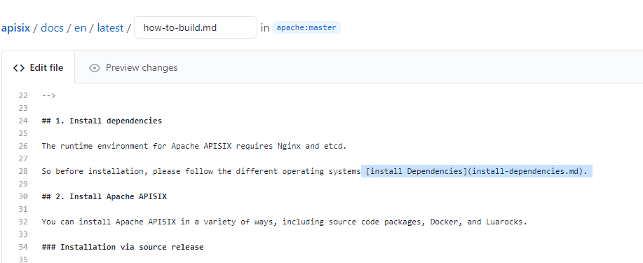 ########## File path: docs/en/latest/FAQ.md ########## @@ -318,7 +318,7 @@ The high availability of APISIX can be divided into two parts: ## Why does the `make deps` command fail in source installation? -When executing the `make deps` command, an error such as the one shown below occurs. This is caused by the missing openresty's `openssl` development kit, you need to install it first. Please refer to the [install-dependencies.md](install-dependencies.md) document for installation. +When executing the `make deps` command, an error such as the one shown below occurs. This is caused by the missing openresty's `openssl` development kit, you need to install it first. Please refer to the [install-dependencies.md](https://github.com/apache/apisix/blob/master/docs/en/latest/install-dependencies.md) document for installation. Review comment: No I think it will work fine without adding install-dependencies to latest/config.json as same as how to build doc.   -- This is an automated message from the Apache Git Service. To respond to the message, please log on to GitHub and use the URL above to go to the specific comment. For queries about this service, please contact Infrastructure at: [email protected]