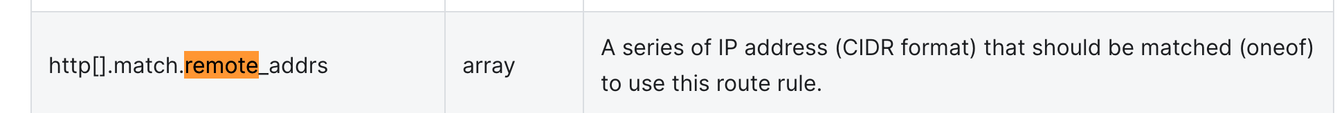 ### Issue description The `remoteAddrs` field was written as `remote_addrs`.  ### Environment * your apisix-ingress-controller version (output of `apisix-ingress-controller version --long`); * your Kubernetes cluster version (output of `kubectl version`); * if you run apisix-ingress-controller in Bare-metal environment, also show your OS version (`uname -a`). ### Minimal test code / Steps to reproduce the issue 1. 2. 3. ### What's the actual result? (including assertion message & call stack if applicable) ### What's the expected result? -- This is an automated message from the Apache Git Service. To respond to the message, please log on to GitHub and use the URL above to go to the specific comment. For queries about this service, please contact Infrastructure at: [email protected]