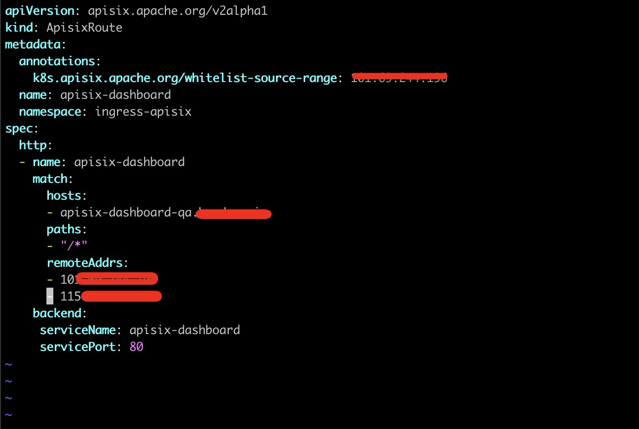 > ### Issue description >  > >  > > i set the whitelist annotation, but i can still access the domain. > > ### Environment > Version: 0.5.0 > Git SHA: > Go Version: go1.13.8 > Building OS/Arch: linux/amd64 > Running OS/Arch: linux/amd64 > > Client Version: version.Info{Major:"1", Minor:"18+", GitVersion:"v1.18.8-aliyun.1", GitCommit:"d2f5a0f", GitTreeState:"", BuildDate:"2020-11-17T03:28:04Z", GoVersion:"go1.13.15", Compiler:"gc", Platform:"linux/amd64"} > Server Version: version.Info{Major:"1", Minor:"18+", GitVersion:"v1.18.8-aliyun.1", GitCommit:"5959bcb", GitTreeState:"", BuildDate:"2021-03-11T11:16:47Z", GoVersion:"go1.13.15", Compiler:"gc", Platform:"linux/amd64"} > @shuoshadow That's a known bug, we will add it to the ingress resource, for the ApisixRoute, you can just configure the `remoteAddrs` field, see http://apisix.apache.org/docs/ingress-controller/references/apisix_route_v2alpha1 (there is a typo that `remoteAddrs` was written as `remote_addrs`). I configure the field, but the return code is 404, is that right?    -- This is an automated message from the Apache Git Service. To respond to the message, please log on to GitHub and use the URL above to go to the specific comment. For queries about this service, please contact Infrastructure at: [email protected]