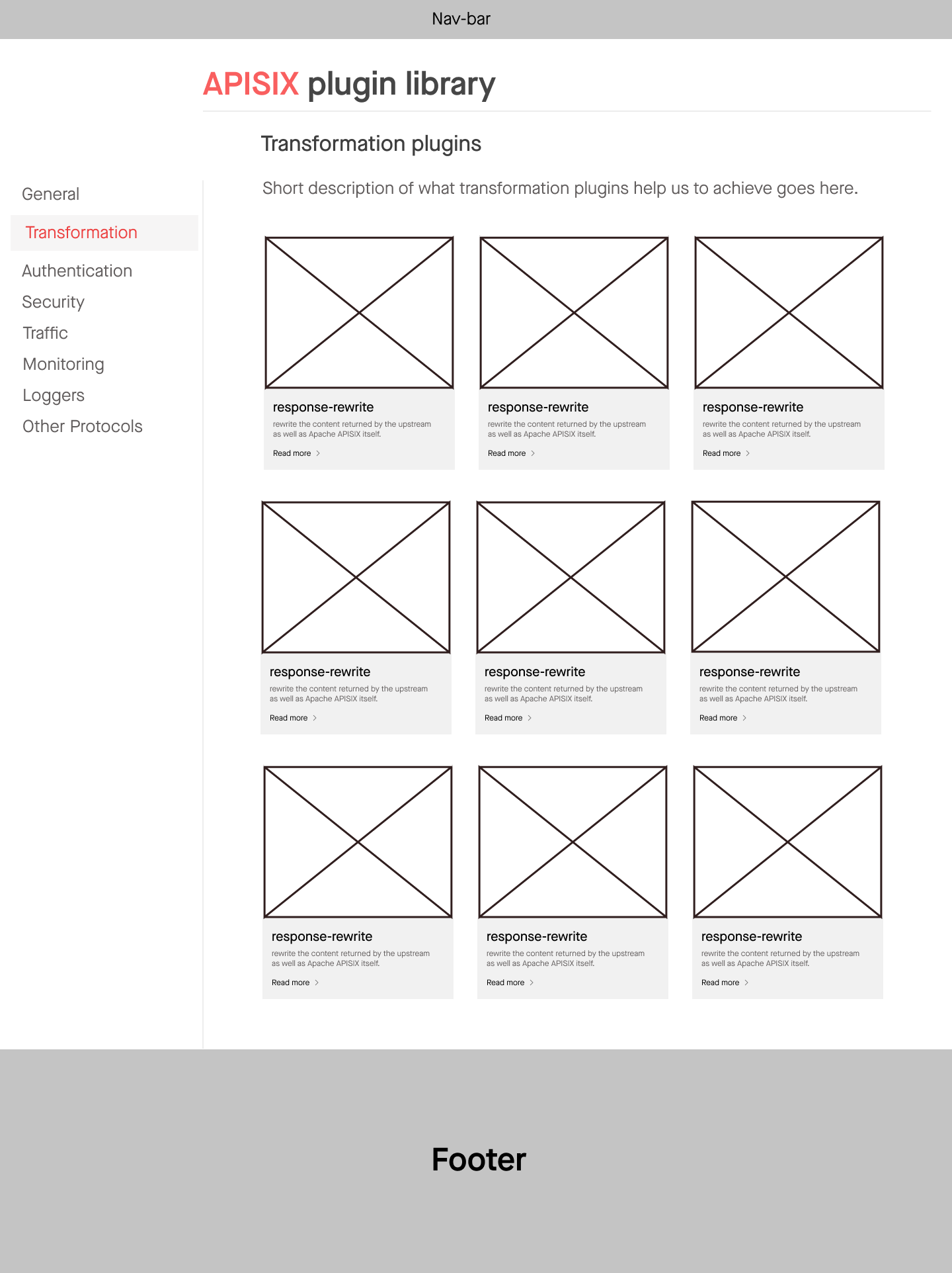 A quick wireframe can base development on this.  Some background, in the plugin cards those crossed boxes are where the plugin icon will go. The structure of cards is like this -> >> Plugin icon >> Plugin name >> Small concise description of plugin (taken from docs) >> Read more, a link to the related plugin in docs like - https://apisix.apache.org/docs/apisix/plugins/#pluginName I was thinking of adding a "search plugin by name" option but have dropped it for now in this one given that the plugin lists are not so long really. If we do need one we can add a global search option on plugins regardless of type. If you want to see the figma board - https://www.figma.com/file/Z46kvRBwmA4PS5FnCCfTrU/Plugin-library?node-id=3%3A2 -- This is an automated message from the Apache Git Service. To respond to the message, please log on to GitHub and use the URL above to go to the specific comment. To unsubscribe, e-mail: [email protected] For queries about this service, please contact Infrastructure at: [email protected]