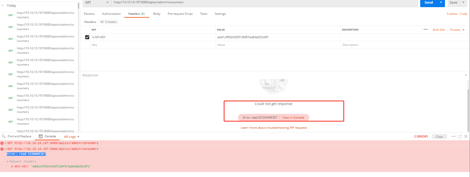 ### Issue description Curl is available on the server and other server requests, but the local postman request keeps getting Error: read   ECONNRESET### Environment Bug report without environment information will be ignored or closed. * apisix version (cmd: `apisix version`):2.8 * OS (cmd: `uname -a`):Linux slave1 3.10.0-514.el7.x86_64 #1 SMP Tue Nov 22 16:42:41 UTC 2016 x86_64 x86_64 x86_64 GNU/Linux * OpenResty / Nginx version (cmd: `nginx -V` or `openresty -V`):nginx version: openresty/1.19.3.2 * etcd version, if have (cmd: run `curl http://127.0.0.1:9090/v1/server_info` to get the info from server-info API):3.4.0 * apisix-dashboard version, if have:2.7 * luarocks version, if the issue is about installation (cmd: `luarocks --version`):3.4 ### Minimal test code / Steps to reproduce the issue Bug report without steps to reproduce will be ignored or closed. 1.  2.  -- This is an automated message from the Apache Git Service. To respond to the message, please log on to GitHub and use the URL above to go to the specific comment. To unsubscribe, e-mail: [email protected] For queries about this service, please contact Infrastructure at: [email protected]