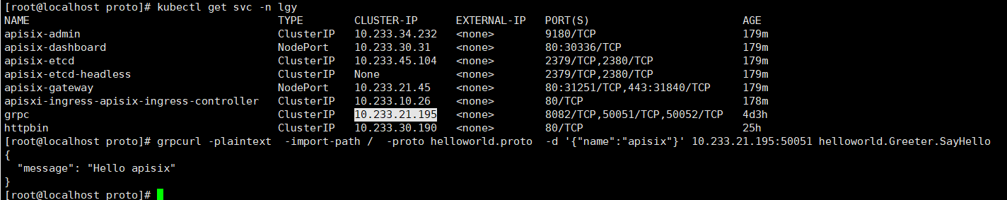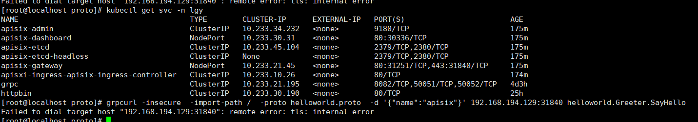 目前使用helm安装apisix和controller,controller自己打的1.2.0镜像,现在想调试grpc问题 以下是响应信息  apisix日志信息  这边创建router全部使用编码形式创建,下面就是全部过程 ```` func Test_Client(t *testing.T) { //BuildCons() BuildApiSixUpStream() BuildApisixTls() BuildRoute() //DeleteRouter() } func BuildRoute() { w := int(100) v2b := &v2beta1.ApisixRoute{ TypeMeta: metav1.TypeMeta{ Kind:"ApisixRoute", APIVersion:"apisix.apache.org/v2beta1", }, ObjectMeta:metav1.ObjectMeta{ Name: "grpc-test", Namespace: "lgy", }, Spec: v2beta1.ApisixRouteSpec{ HTTP:[]v2beta1.ApisixRouteHTTP{ v2beta1.ApisixRouteHTTP{ Name: "grpc", Match: v2beta1.ApisixRouteHTTPMatch{ Hosts: []string{"test.grpc.com"}, Paths: []string{"/helloworld.Greeter/SayHello"}, }, Backend:v2alpha1.ApisixRouteHTTPBackend{ ServiceName: "grpc", ServicePort: intstr.IntOrString{ Type: intstr.Int, IntVal: 50051, }, Weight:&w, }, Authentication:v2beta1.ApisixRouteAuthentication{ Enable: false, Type: "keyAuth", }, }, }, }, } _, err := client.ApisixV2beta1().ApisixRoutes("lgy").Create(context.Background(),v2b,v1.CreateOptions{}) fmt.Println(err) } func BuildApisixTls() { crt := `-----BEGIN CERTIFICATE----- MIIC7DCCAdSgAwIBAgIRAJ7uP9Z8WqLYKSVypp5KGTUwDQYJKoZIhvcNAQELBQAw GDEWMBQGA1UEAxMNdGVzdC5ncnBjLmNvbTAeFw0yMTA4MjQwNzEzMzVaFw0yMjA4 MjQwNzEzMzVaMBgxFjAUBgNVBAMTDXRlc3QuZ3JwYy5jb20wggEiMA0GCSqGSIb3 DQEBAQUAA4IBDwAwggEKAoIBAQDIOsafOWgcI8h9KUFo9b1hHb+bZiy7QLZMs4yi GVc7RTvT+o7ZDnsQnpm2WrH+cz+DvihoYF+/gw1rnb12gEltMNjLa+r4XdCdljA9 +t8Wx8BSUXQ4AYHHlKvE5PMz6CZh3a+FokS4gIXbIFkAivpfE16rHXcxj/ETzPi9 245iSZ44uXj0sGz8A0WsvwhY+RSuZ3sBFE2kUGYMTFAW/4BY7erJs7v6wLuw2jVO CtvoMlZDAIzOj6peH/AfvkSAZwSyi7AfqbYXHruUshB5Pf8LFmTplFfaDSez9Bnh WbWXMhVS/pzTXGSRvmLOWs+237MyU0ooO2JctqvW4mYpL38tAgMBAAGjMTAvMA4G A1UdDwEB/wQEAwICpDAdBgNVHSUEFjAUBggrBgEFBQcDAQYIKwYBBQUHAwEwDQYJ KoZIhvcNAQELBQADggEBAIZ2h0HHPgXAa4+OBCu+COXYeUUfD0cuOC2Te0qg8jBp p9sFebNtdBVTUVGAhje0gIXDa1GwPo3NXywrNyeJrFpQKKKYJ76otarSqp8sIA2W QsAMyxhy7hUfPXmfZgtMnemaoCvAwgHr/eXe7pZ8xtfw/T0EoFfywIfcA3pRniUN +IN1FvcpXhzjTZSP5+yEALcFXZMy55WaTUKy+psR3p1dEBkLuHBkVcqc6U06tkE+ JfK1WwE00v0s9SKvyFpTk2iGG5Gh2YFtJCutB8TCwozyabVV0iHyDnJUfscPv2Wz vr6B1T+fQT8Abn9ua/US0mujm8qWKwZIOtyE8GjEemg= -----END CERTIFICATE-----` key := `-----BEGIN RSA PRIVATE KEY----- MIIEpQIBAAKCAQEAyDrGnzloHCPIfSlBaPW9YR2/m2Ysu0C2TLOMohlXO0U70/qO 2Q57EJ6Ztlqx/nM/g74oaGBfv4MNa529doBJbTDYy2vq+F3QnZYwPfrfFsfAUlF0 OAGBx5SrxOTzM+gmYd2vhaJEuICF2yBZAIr6XxNeqx13MY/xE8z4vduOYkmeOLl4 9LBs/ANFrL8IWPkUrmd7ARRNpFBmDExQFv+AWO3qybO7+sC7sNo1Tgrb6DJWQwCM zo+qXh/wH75EgGcEsouwH6m2Fx67lLIQeT3/CxZk6ZRX2g0ns/QZ4Vm1lzIVUv6c 01xkkb5izlrPtt+zMlNKKDtiXLar1uJmKS9/LQIDAQABAoIBAQC+DXwGGjlFrHla w9QASnCNQ+1hFWSUAGKI/0wXeLIh4h9dn9ADGwmYxtHkEsYsXTwGUnKMUB3R7BTK 9xik6DPJ3rmIrFCFmpavXaVAz2T9fHCCMip8FoIW7Hj2FNL7i/kSn5dA4rsT3Xow ec3BBCmOIRaUmQ1QD+6l+sKHg2TsyIH61KReiHZ32FOudXGILnM7xluwRpMBfC6j bkm9xgLXD8l8zFYYA4/4kf4RmBbrHptsKtAF2zFqN3K2vazrzxJWLidFqEMYn82r FTi1FeoPYDeKHZ6Ge/g+t02zhBBmZMGBojh+1XyN1+SZ3TshaBE/D7Zpt1mNb7fi eRD/c1kJAoGBAOXWNCWJKGfKDyFXE6MWONh51vro09UB4XZKgB8fOf1UjEG4JN6b xzxNgRh1pbowjcBZXGUddX0CLD+EcCHgBofnEN35MBFhJdAefAwwUCtiosb7q31f XLZYCdIhRSEHrSH5PRh0hMZezU2geNYhnioVuUX15HsZQHo6kVZCUxbnAoGBAN8F xkcaIEjRQ6C/NzG/COoxi6NirEN/KwY+tANJgOoaOSWF2cCaaxLGZY4NYj2ZGcW2 pqXuiiBMqfaoUxmKuM+KlBugbn7z8A3Yls+S+FD1B3HvTdVeF/tzgZms7bDGDSLu R8SMnQSM++NJHmzq3fMPpHzvdSd+KG7J60y5hDrLAoGBAN7+n4Wzt/JLh7aPZ8wa KXlPbZfwAmdu9bPxwLFxeLAkMhkpcwxRFFOb1x9GNk+aAE6Z5R1uIanyS8As3Sbg 1zVQqXrU5SBXo3pzuWOSFJajks+BKvfvaGK6tHyeLxZG/mIyEmcB1jkpjgQ9KECK SY0HmsUYOGB/NaHh5VVN8JQNAoGAMZsGNDByd9/b6/g8HZuBLx4gEhJTgJvbhQMT ZRvHScrVZSw1d+qg4EcytXrynALewaRTwtqg7HhA4bUk7qx1WOxY7yArE5/MiDfh q3/kLZWit0vkAw5vxSU28WiOYeBbcaaQXf5sumNlb3OHCfDftz2Gd6eHZmZgNexB owosiCsCgYEAkkU/zEEpoxs5nrx3vmhwm2J22W9RC8ZQPQckiyxO+sSpo3xhuHT2 jOZlqvSrRw7UxQFsZsv8YJxFiOZUvEjbW9NaegCrF2bkuOaOw4YZMQLnS3JtV92T 30N5sLp4QYjHKP7/D4FozPiBiGFL0i3/wNjVRvtM5GEarajr3yJHe0E= -----END RSA PRIVATE KEY-----` certSecretData := make(map[string][]byte) certSecretData["cert"] = []byte(crt) certSecretData["key"] = []byte(key) secret := &corev1.Secret{ ObjectMeta: metav1.ObjectMeta{ Name: "grpc", }, Data: certSecretData, Type: corev1.SecretTypeOpaque, } result, err := clientset.CoreV1().Secrets("lgy").Create(context.TODO(),secret,v1.CreateOptions{}) fmt.Println(err) fmt.Println(result) cons := &apisixv1.ApisixTls{ ObjectMeta:metav1.ObjectMeta{ Name: "grpc", Namespace: "lgy", }, Spec:&apisixv1.ApisixTlsSpec{ Hosts: []apisixv1.HostType{ "test.grpc.com", }, Secret: apisixv1.ApisixSecret{ Name: "grpc", Namespace: "lgy", }, }, } results, err := client.ApisixV1().ApisixTlses("lgy").Create(context.TODO(),cons,v1.CreateOptions{}) fmt.Println(err) fmt.Println(results) } func BuildApiSixUpStream() { grpc := &apisixv1.ApisixUpstream{ ObjectMeta:metav1.ObjectMeta{ Name: "grpc", Namespace: "lgy", }, Spec: &apisixv1.ApisixUpstreamSpec{ PortLevelSettings:[]apisixv1.PortLevelSettings{ apisixv1.PortLevelSettings{ Port: 50051, ApisixUpstreamConfig:apisixv1.ApisixUpstreamConfig{ Scheme:"grpc", }, }, }, }, } result, err := client.ApisixV1().ApisixUpstreams("lgy").Create(context.TODO(),grpc,v1.CreateOptions{}) fmt.Println(err) fmt.Println(result) } func BuildCons() { cons := &v2alpha1.ApisixConsumer{ ObjectMeta:metav1.ObjectMeta{ Name: "grpc", Namespace: "lgy", }, Spec:v2alpha1.ApisixConsumerSpec{ AuthParameter:v2alpha1.ApisixConsumerAuthParameter{ KeyAuth:&v2alpha1.ApisixConsumerKeyAuth{ //Value: &v2alpha1.ApisixConsumerKeyAuthValue{ // Key: "lgy", //}, SecretRef:&corev1.LocalObjectReference{ Name: "mysecret", }, }, }, }, } result, err := client.ApisixV2alpha1().ApisixConsumers("lgy").Create(context.TODO(),cons,v1.CreateOptions{}) fmt.Println(err) fmt.Println(result) } ```` 生成证书的代码: ```` func CreatCert() { max := new(big.Int).Lsh(big.NewInt(1), 128) serialNumber, _ := rand.Int(rand.Reader, max) subject := pkix.Name{ CommonName: "test.grpc.com", } template := x509.Certificate{ SerialNumber: serialNumber, Subject: subject, NotBefore