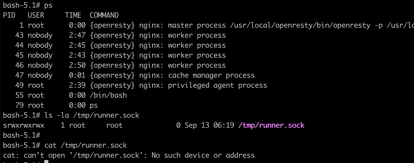 > Can you confirm the process in the container has the right to access the sock file created by Go runner? > Does it work if you put the Go runner inside the container? > Check the running status of the runner by executing the `ps` command in the container?  -- This is an automated message from the Apache Git Service. To respond to the message, please log on to GitHub and use the URL above to go to the specific comment. To unsubscribe, e-mail: [email protected] For queries about this service, please contact Infrastructure at: [email protected]