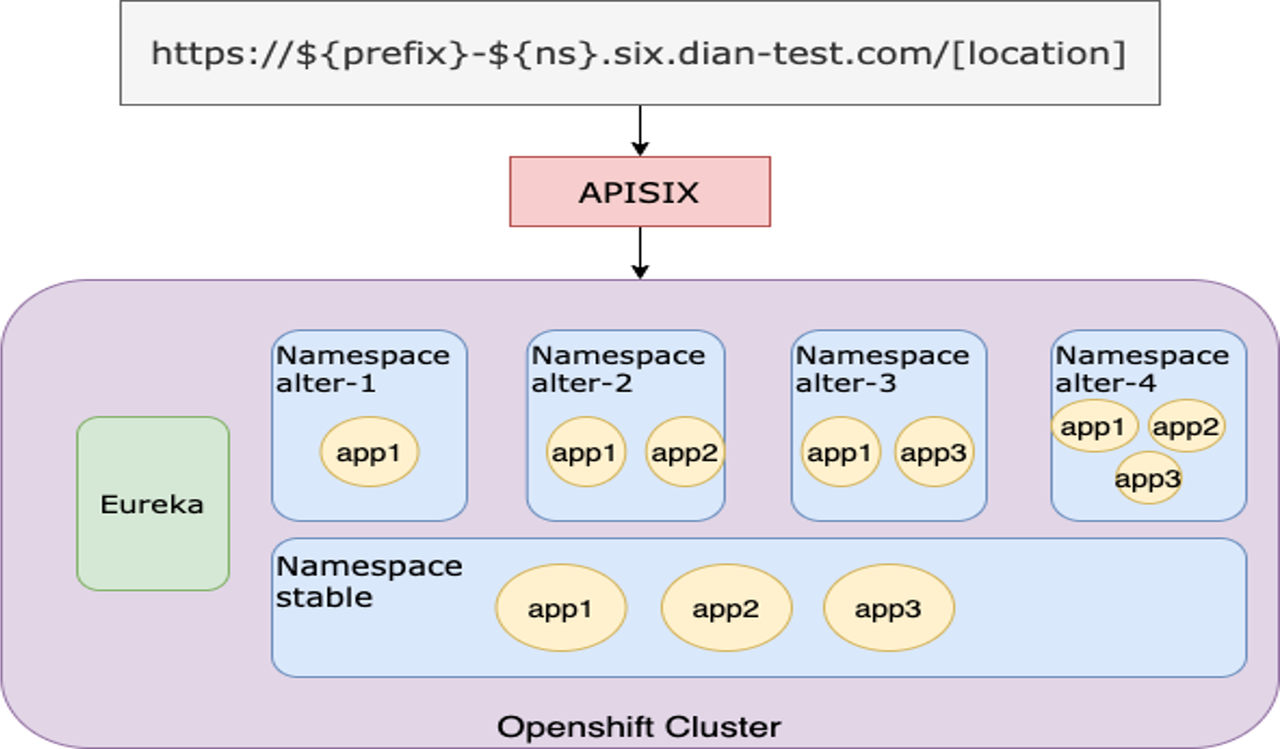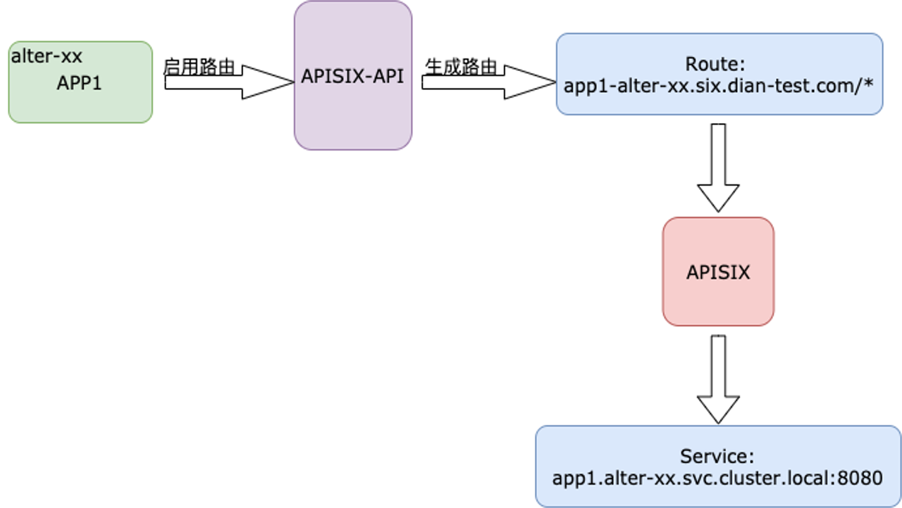 另一种场景就是多级路径路由。在这种场景下我们基于 Apache APISIX 将项目变更中需要的多个 APP 路由指向到当前 Namespace