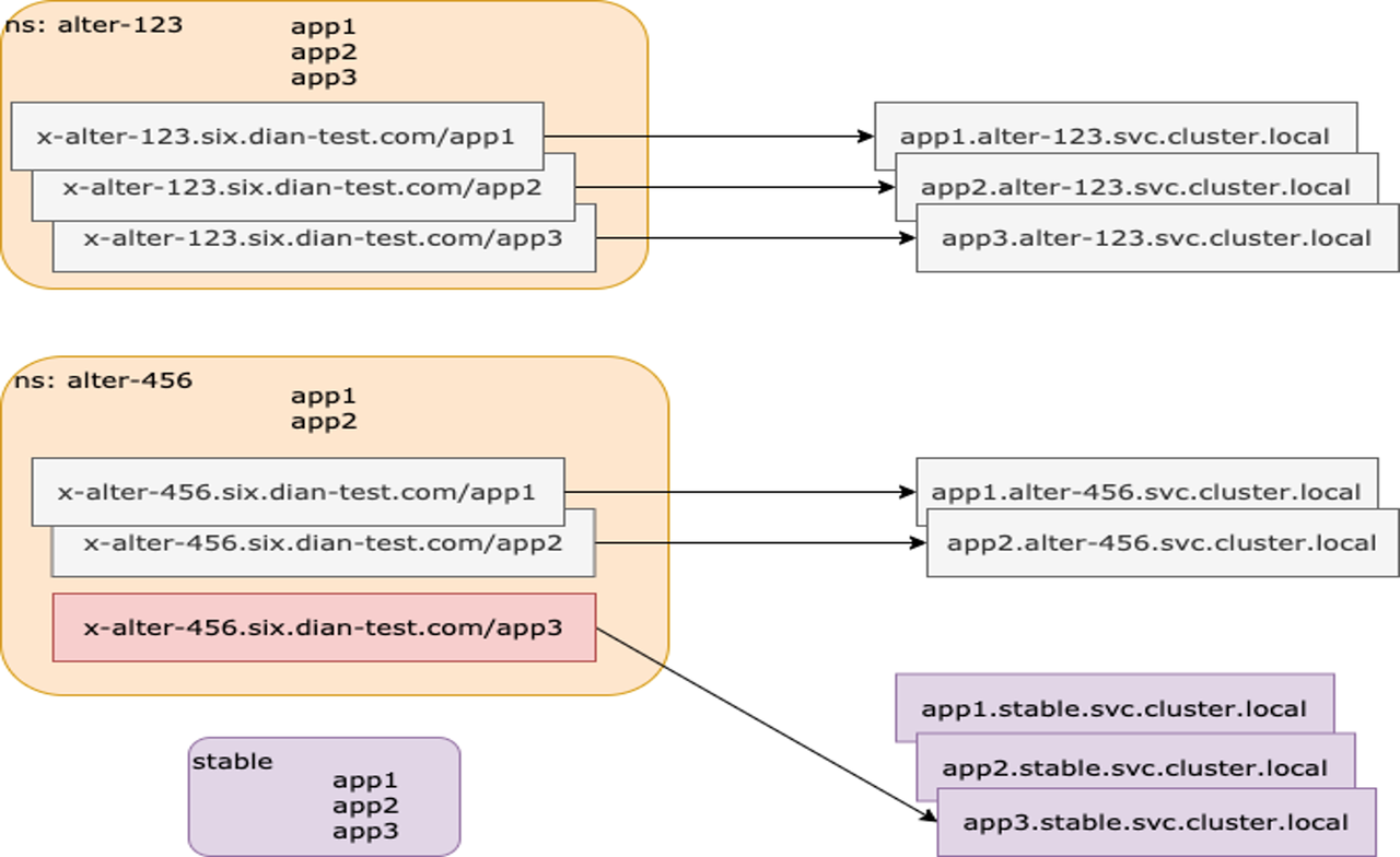 环境,其关联 APP 路由则指向到一套稳定的 Namespace 环境中(通常为 Stable 环境)。