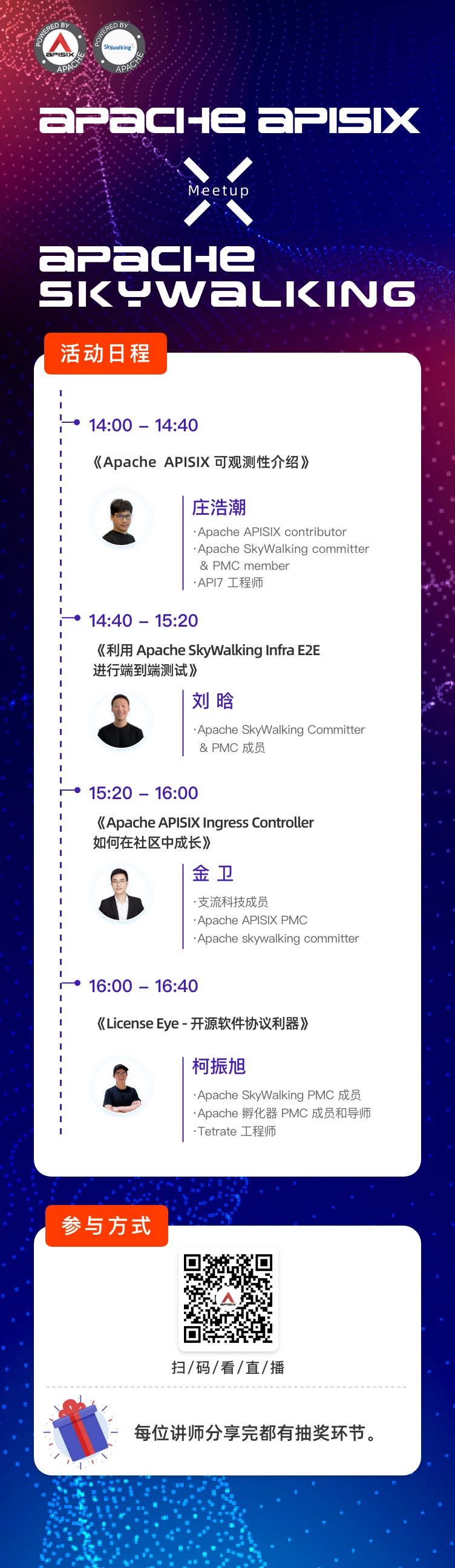 ########## File path: website/blog/2021/10/18/meetup.md ########## @@ -0,0 +1,66 @@ +--- +title: 直播预告 | Apache APISIX × Apache SkyWalking 线上分享 +keywords: +- Apache APISIX +- Apache SkyWalking +- Meetup +- 分享 +description: 10 月 23 日,Apache APISIX 社区联合 Apache SkyWalking 社区为大家带来线上分享。 +tags: [Events] +--- +> 10 月 23 日,Apache APISIX 社区联合 Apache SkyWalking 社区为大家带来线上分享,快来看看有哪些精彩的议题吧。 +<!--truncate--> + + + +## 分享议题 + +### Apache APISIX 可观测性介绍 + +#### 分享嘉宾 + +庄浩潮,Apache APISIX contributor,Apache SkyWalking committer & PMC member + +#### 议题详情 + +Apache APISIX 相对原生 Nginx 有比较完善可观测性能力,将介绍 Apache APISIX 已经监控手段和能力。以及与 SkyWalking 集成之后,有哪些功能的增强,将来还会带哪些新特性。一起期待红蓝(APISIX X SkyWalking)组合能带来哪些火花。 Review comment: 已有的监控手段和能力 ########## File path: website/blog/2021/10/18/meetup.md ########## @@ -0,0 +1,66 @@ +--- +title: 直播预告 | Apache APISIX × Apache SkyWalking 线上分享 +keywords: +- Apache APISIX +- Apache SkyWalking +- Meetup +- 分享 +description: 10 月 23 日,Apache APISIX 社区联合 Apache SkyWalking 社区为大家带来线上分享。 +tags: [Events] +--- +> 10 月 23 日,Apache APISIX 社区联合 Apache SkyWalking 社区为大家带来线上分享,快来看看有哪些精彩的议题吧。 +<!--truncate--> + + + +## 分享议题 + +### Apache APISIX 可观测性介绍 + +#### 分享嘉宾 + +庄浩潮,Apache APISIX contributor,Apache SkyWalking committer & PMC member + +#### 议题详情 + +Apache APISIX 相对原生 Nginx 有比较完善可观测性能力,将介绍 Apache APISIX 已经监控手段和能力。以及与 SkyWalking 集成之后,有哪些功能的增强,将来还会带哪些新特性。一起期待红蓝(APISIX X SkyWalking)组合能带来哪些火花。 + +### 利用 Apache SkyWalking Infra E2E 进行端到端测试 + +#### 分享嘉宾 + +刘晗,Apache SkyWalking Committer & PMC 成员 + +#### 议题详情 + +现在越来越多的项目开始利用端到端测试来完成自动化功能检测,本次分享着重讲解 SkyWalking-Infra-E2E 框架与其在 Apache SkyWalking 中的落地 + +### Apache APISIX Ingress Controller 如何在社区中成长 + +#### 分享嘉宾 + +金卫,Apache APISIX PMC,Apache skywalking committer Review comment: SkyWalking Committer ########## File path: website/blog/2021/10/18/meetup.md ########## @@ -0,0 +1,66 @@ +--- +title: 直播预告 | Apache APISIX × Apache SkyWalking 线上分享 +keywords: +- Apache APISIX +- Apache SkyWalking +- Meetup +- 分享 +description: 10 月 23 日,Apache APISIX 社区联合 Apache SkyWalking 社区为大家带来线上分享。 +tags: [Events] +--- +> 10 月 23 日,Apache APISIX 社区联合 Apache SkyWalking 社区为大家带来线上分享,快来看看有哪些精彩的议题吧。 +<!--truncate--> + + + +## 分享议题 + +### Apache APISIX 可观测性介绍 + +#### 分享嘉宾 + +庄浩潮,Apache APISIX contributor,Apache SkyWalking committer & PMC member + +#### 议题详情 + +Apache APISIX 相对原生 Nginx 有比较完善可观测性能力,将介绍 Apache APISIX 已经监控手段和能力。以及与 SkyWalking 集成之后,有哪些功能的增强,将来还会带哪些新特性。一起期待红蓝(APISIX X SkyWalking)组合能带来哪些火花。 + +### 利用 Apache SkyWalking Infra E2E 进行端到端测试 + +#### 分享嘉宾 + +刘晗,Apache SkyWalking Committer & PMC 成员 + +#### 议题详情 + +现在越来越多的项目开始利用端到端测试来完成自动化功能检测,本次分享着重讲解 SkyWalking-Infra-E2E 框架与其在 Apache SkyWalking 中的落地 Review comment: add 。 ########## File path: website/blog/2021/10/18/meetup.md ########## @@ -0,0 +1,66 @@ +--- +title: 直播预告 | Apache APISIX × Apache SkyWalking 线上分享 +keywords: +- Apache APISIX +- Apache SkyWalking +- Meetup +- 分享 +description: 10 月 23 日,Apache APISIX 社区联合 Apache SkyWalking 社区为大家带来线上分享。 +tags: [Events] +--- +> 10 月 23 日,Apache APISIX 社区联合 Apache SkyWalking 社区为大家带来线上分享,快来看看有哪些精彩的议题吧。 +<!--truncate--> + + + +## 分享议题 + +### Apache APISIX 可观测性介绍 + +#### 分享嘉宾 + +庄浩潮,Apache APISIX contributor,Apache SkyWalking committer & PMC member Review comment: PMC 成员 ########## File path: website/blog/2021/10/18/meetup.md ########## @@ -0,0 +1,66 @@ +--- +title: 直播预告 | Apache APISIX × Apache SkyWalking 线上分享 +keywords: +- Apache APISIX +- Apache SkyWalking +- Meetup +- 分享 +description: 10 月 23 日,Apache APISIX 社区联合 Apache SkyWalking 社区为大家带来线上分享。 +tags: [Events] +--- +> 10 月 23 日,Apache APISIX 社区联合 Apache SkyWalking 社区为大家带来线上分享,快来看看有哪些精彩的议题吧。 +<!--truncate--> + + + +## 分享议题 + +### Apache APISIX 可观测性介绍 + +#### 分享嘉宾 + +庄浩潮,Apache APISIX contributor,Apache SkyWalking committer & PMC member Review comment: Committer ########## File path: website/blog/2021/10/18/meetup.md ########## @@ -0,0 +1,66 @@ +--- +title: 直播预告 | Apache APISIX × Apache SkyWalking 线上分享 +keywords: +- Apache APISIX +- Apache SkyWalking +- Meetup +- 分享 +description: 10 月 23 日,Apache APISIX 社区联合 Apache SkyWalking 社区为大家带来线上分享。 +tags: [Events] +--- +> 10 月 23 日,Apache APISIX 社区联合 Apache SkyWalking 社区为大家带来线上分享,快来看看有哪些精彩的议题吧。 +<!--truncate--> + + + +## 分享议题 + +### Apache APISIX 可观测性介绍 + +#### 分享嘉宾 + +庄浩潮,Apache APISIX contributor,Apache SkyWalking committer & PMC member + +#### 议题详情