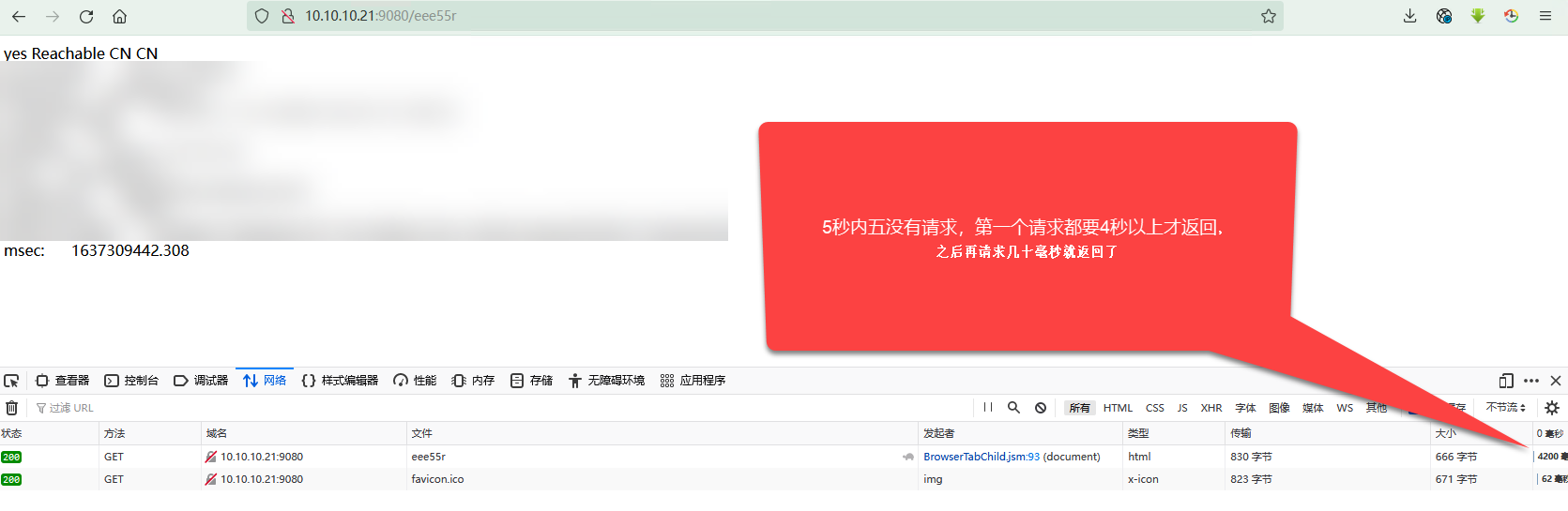 ### Issue description # 5秒内第一次请求需要4秒左右才返回  ### Environment - apisix version (cmd: ``): ```bash 最新版 2.10.1 ``` - OS (cmd: `Centos7`): ```bash Centos7 ``` - OpenResty / Nginx version (cmd: ``): ```bash [root@Node_10.10.10.21 /usr/local/apisix/dashboard/logs]# openresty -V nginx version: openresty/1.19.9.1 built by gcc 9.3.1 20200408 (Red Hat 9.3.1-2) (GCC) built with OpenSSL 1.1.1k 25 Mar 2021 (running with OpenSSL 1.1.1l 24 Aug 2021) TLS SNI support enabled configure arguments: --prefix=/usr/local/openresty/nginx --with-cc-opt='-O2 -DNGX_LUA_ABORT_AT_PANIC -I/usr/local/openresty/zlib/include -I/usr/local/openresty/pcre/include -I/usr/local/openresty/openssl111/include' --add-module=../ngx_devel_kit-0.3.1 --add-module=../echo-nginx-module-0.62 --add-module=../xss-nginx-module-0.06 --add-module=../ngx_coolkit-0.2 --add-module=../set-misc-nginx-module-0.32 --add-module=../form-input-nginx-module-0.12 --add-module=../encrypted-session-nginx-module-0.08 --add-module=../srcache-nginx-module-0.32 --add-module=../ngx_lua-0.10.20 --add-module=../ngx_lua_upstream-0.07 --add-module=../headers-more-nginx-module-0.33 --add-module=../array-var-nginx-module-0.05 --add-module=../memc-nginx-module-0.19 --add-module=../redis2-nginx-module-0.15 --add-module=../redis-nginx-module-0.3.7 --add-module=../ngx_stream_lua-0.0.10 --with-ld-opt='-Wl,-rpath,/usr/local/openresty/luajit/lib -L/usr/local/openresty/zlib/lib -L/usr/local/openresty/pcre/lib -L/usr/loc al/openresty/openssl111/lib -Wl,-rpath,/usr/local/openresty/zlib/lib:/usr/local/openresty/pcre/lib:/usr/local/openresty/openssl111/lib' --with-cc='ccache gcc -fdiagnostics-color=always' --with-pcre-jit --with-stream --with-stream_ssl_module --with-stream_ssl_preread_module --with-http_v2_module --without-mail_pop3_module --without-mail_imap_module --without-mail_smtp_module --with-http_stub_status_module --with-http_realip_module --with-http_addition_module --with-http_auth_request_module --with-http_secure_link_module --with-http_random_index_module --with-http_gzip_static_module --with-http_sub_module --with-http_dav_module --with-http_flv_module --with-http_mp4_module --with-http_gunzip_module --with-threads --with-compat --with-stream --with-http_ssl_module ``` - etcd version, if have (cmd: run `` to get the info from server-info API): ```bash [root@Node_10.10.10.21 /usr/local/apisix/dashboard/logs]# curl http://127.0.0.1:9090/v1/server_info {"up_time":1108,"last_report_time":1637310514,"id":"30d05fc8-9f69-490a-865e-a86161dfda88","hostname":"etcd-21","version":"2.10.1","boot_time":1637309434,"etcd_version":"3.5.0"} ```bash - apisix-dashboard version, if have: - the plugin runner version, if the issue is about a plugin runner (cmd: depended on the kind of runner): - luarocks version, if the issue is about installation (cmd: `luarocks --version`): ### Steps to reproduce 1. 随便创建一条路由规则,转发到一个后端服务 2. 通过浏览器访问,匹配到该路由进行处理 3. 打开F12会发现,第一个请求需要4秒多才能返回 ### Actual result 3. 打开F12会发现,第一个请求需要4秒多才能返回 ### Error log 没有报错 ### Expected result 为啥第一次请求需要4秒多,再刷新几十毫秒就返回了,后端服务是个动态接口,接口1毫秒就处理完了。 第一个请求也应该几十毫秒就要返回。 -- This is an automated message from the Apache Git Service. To respond to the message, please log on to GitHub and use the URL above to go to the specific comment. To unsubscribe, e-mail: [email protected] For queries about this service, please contact Infrastructure at: [email protected]