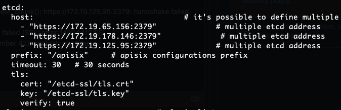 ### Issue description ``` 2021/11/30 10:19:20 [warn] 45#45: *75201 [lua] v3.lua:631: request_chunk(): https://172.19.125.95:2379: handshake failed. Retrying, context: ngx.timer 2021/11/30 10:19:20 [error] 48#48: *75191 SSL_do_handshake() failed (SSL: error:14094412:SSL routines:ssl3_read_bytes:sslv3 alert bad certificate:SSL alert number 42), context: ngx.timer ```   Above is my configuration, I can confirm that the certificate is ok. I saw the previous issue said openResty does not support mTLS? ### Environment - apisix version (cmd: `apisix version`): 2.10.0 - OS (cmd: `uname -a`): - OpenResty / Nginx version (cmd: `nginx -V` or `openresty -V`): - etcd version, if have (cmd: run `curl http://127.0.0.1:9090/v1/server_info` to get the info from server-info API): - apisix-dashboard version, if have: - the plugin runner version, if the issue is about a plugin runner (cmd: depended on the kind of runner): - luarocks version, if the issue is about installation (cmd: `luarocks --version`): -- This is an automated message from the Apache Git Service. To respond to the message, please log on to GitHub and use the URL above to go to the specific comment. To unsubscribe, e-mail: [email protected] For queries about this service, please contact Infrastructure at: [email protected]