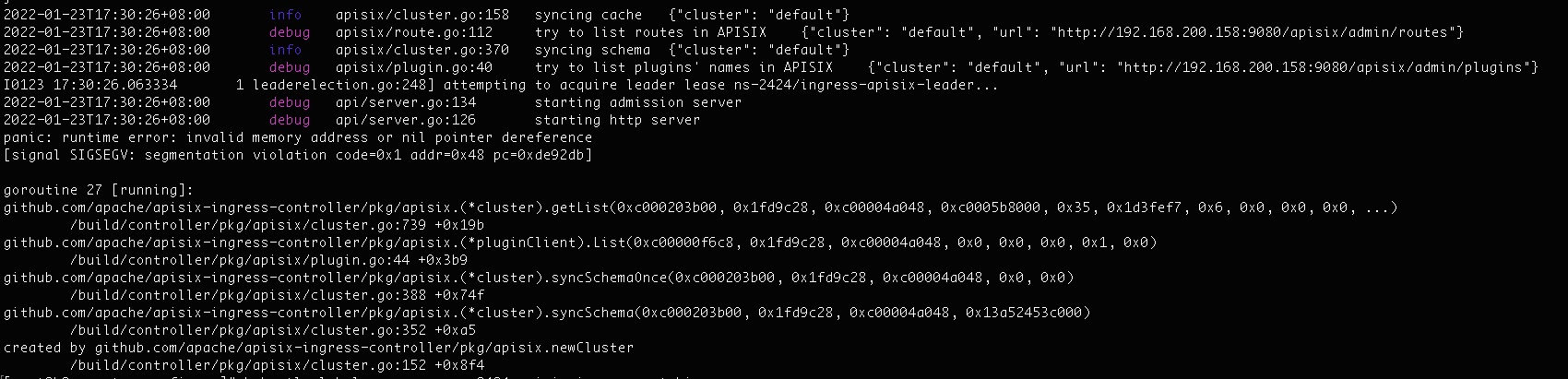### Issue description apisix_ingress_controller run in my cluster,but there is a panic.  what should i do ### Environment 2022-01-23T17:30:26+08:00 info ingress/ingress.go:112 apisix ingress controller started 2022-01-23T17:30:26+08:00 info ingress/ingress.go:114 version: Version: 1.4.0 Git SHA: no-git-module Go Version: go1.16.12 Building OS/Arch: linux/amd64 Running OS/Arch: linux/amd64 K8S Version: 1.18.10 -- This is an automated message from the Apache Git Service. To respond to the message, please log on to GitHub and use the URL above to go to the specific comment. To unsubscribe, e-mail: [email protected] For queries about this service, please contact Infrastructure at: [email protected]