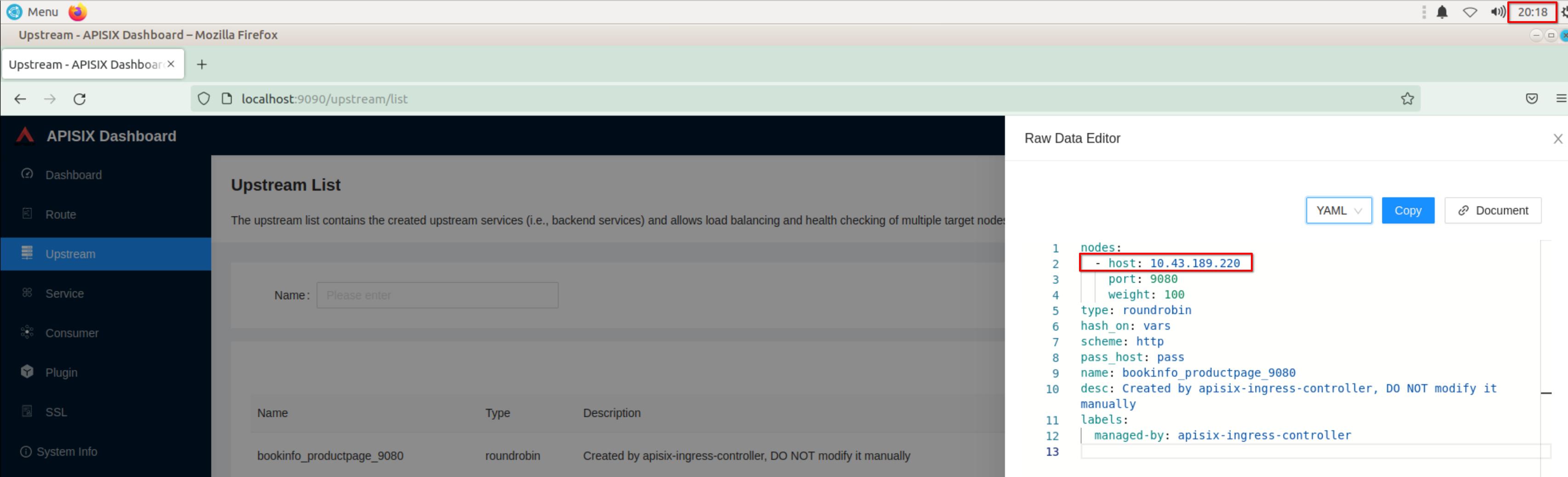 Hi @tao12345666333 I've completed the reinstallation, but after 4 cluster restart the Service address is substituted by a Pod address The route just defined  The route the day after <img width="1716" alt="route after_4_restart" src="https://user-images.githubusercontent.com/11090934/153720696-e30add07-5ade-4644-be2e-14c505da6a97.png"> I installed using the new chart ``` sysop@m01serv:~/software/apisisx$ helm show chart apisix/apisix apiVersion: v2 appVersion: 2.12.0 dependencies: - condition: etcd.enabled name: etcd repository: https://charts.bitnami.com/bitnami version: 6.2.6 - alias: dashboard condition: dashboard.enabled name: apisix-dashboard repository: https://charts.apiseven.com version: 0.4.0 - alias: ingress-controller condition: ingress-controller.enabled name: apisix-ingress-controller repository: https://charts.apiseven.com version: 0.9.0 description: A Helm chart for Apache APISIX icon: https://apache.org/logos/res/apisix/apisix.png maintainers: - name: tao12345666333 name: apisix type: application version: 0.8.2 ``` On this chart I changed ``` ... gateway: type: LoadBalancer ... tls: enabled: true ... dashboard: enabled: true ingress-controller: enabled: true ``` The stream modification from issue #851 is no more applicable. The below code gives a syntax error (expected integer received string) ``` ... stream: # L4 proxy (TCP/UDP) see bug #851 enabled: true only: false tcp: # TCP proxy address list - 9100 - "127.0.0.1:9101" udp: # UDP proxy address list - 9200 - "127.0.0.1:9211" ``` Apisix installed with ``` kubectl create ns apisix kubectl label namespace apisix istio-injection=enabled helm install apisix apisix/apisix -f apisix-values.yaml \ --set ingress-controller.config.apisix.serviceNamespace=apisix \ --set ingress-controller.config.apisix.serviceName=apisix-admin \ --namespace apisix ``` Defining the route as ``` apiVersion: apisix.apache.org/v2beta2 kind: ApisixRoute metadata: name: productpage spec: http: - name: rule1 match: hosts: - www2.m01.net paths: - /* backends: - serviceName: productpage servicePort: 9080 resolveGranularity: service ``` The only strange thing in the apisix-ingress-controller log is that verdion **v2beta1** is deprecated in favor of **v2beta3** But in the yaml file there is **v2beta2** ``` [GIN] 2022/02/12 - 03:25:30 | 200 | 31.569µs | 127.0.0.6 | GET "/healthz" [GIN] 2022/02/12 - 03:25:30 | 200 | 20.218µs | 127.0.0.6 | GET "/healthz" W0212 03:25:35.736793 1 warnings.go:70] apisix.apache.org/v2beta1 ApisixRoute is deprecated; use apisix.apache.org/v2beta3 ApisixRoute [GIN] 2022/02/12 - 03:25:40 | 200 | 43.57µs | 127.0.0.6 | GET "/healthz" [GIN] 2022/02/12 - 03:25:40 | 200 | 18.58µs | 127.0.0.6 | GET "/healthz" ``` The apisix-ingress controller at startup (today) ``` 2022-02-12T16:49:19.277Z | I0213 00:49:19.277167 1 request.go:665] Waited for 1.163982311s due to client-side throttling, not priority and fairness, request: GET:https://10.43.0.1:443/apis/apisix.apache.org/v2beta3/namespaces/longhorn-system/apisixconsumers 2022-02-12T16:49:20.101Z | 2022-02-13T00:49:20+08:00 [34minfo[0m ingress/controller.go:549 controller now is running as leader {"namespace": "apisix", "pod": "apisix-ingress-controller-6846db58b8-lsv6g"} 2022-02-12T16:49:20.101Z | 2022-02-13T00:49:20+08:00 [34minfo[0m ingress/apisix_pluginconfig.go:57 ApisixPluginConfig controller started 2022-02-12T16:49:20.101Z | 2022-02-13T00:49:20+08:00 [34minfo[0m ingress/endpoint.go:56 endpoints controller started 2022-02-12T16:49:20.101Z | 2022-02-13T00:49:20+08:00 [34minfo[0m ingress/ingress.go:59 ingress controller started 2022-02-12T16:49:20.101Z | 2022-02-13T00:49:20+08:00 [34minfo[0m ingress/apisix_tls.go:58 ApisixTls controller started 2022-02-12T16:49:20.101Z | 2022-02-13T00:49:20+08:00 [34minfo[0m ingress/apisix_cluster_config.go:57 ApisixClusterConfig controller started 2022-02-12T16:49:20.101Z | 2022-02-13T00:49:20+08:00 [34minfo[0m ingress/secret.go:62 secret controller started 2022-02-12T16:49:20.101Z | 2022-02-13T00:49:20+08:00 [34minfo[0m ingress/apisix_upstream.go:58 ApisixUpstream controller started 2022-02-12T16:49:20.101Z | 2022-02-13T00:49:20+08:00 [34minfo[0m ingress/apisix_consumer.go:56 ApisixConsumer controller started 2022-02-12T16:49:20.101Z | 2022-02-13T00:49:20+08:00 [34minfo[0m ingress/apisix_route.go:59 ApisixRoute controller started 2022-02-12T16:49:20.101Z | 2022-02-13T00:49:20+08:00 [34minfo[0m ingress/namespace.go:71 namespace controller started 2022-02-12T16:49:20.101Z | 2022-02-13T00:49:20+08:00 [34minfo[0m ingress/pod.go:47 pod controller started 2022-02-12T16:49:20.102Z | W0213 00:49:20.102458 1 warnings.go:70] apisix.apache.org/v2beta1 ApisixRoute is deprecated; use apisix.apache.org/v2beta3 ApisixRoute 2022-02-12T16:49:20.106Z | W0213 00:49:20.106277 1 warnings.go:70] apisix.apache.org/v2beta1 ApisixRoute is deprecated; use apisix.apache.org/v2beta3 ApisixRoute 2022-02-12T16:49:20.243Z | 2022-02-13T00:49:20+08:00 [33mwarn[0m apisix/upstream.go:70 upstream not found {"name": "istio-system_grafana_3000", "url": "http://apisix-admin.apisix.svc.cluster.local:9180/apisix/admin/upstreams/256603fb", "cluster": "default"} 2022-02-12T16:49:20.243Z | 2022-02-13T00:49:20+08:00 [33mwarn[0m ingress/controller.go:653 upstream is not referenced {"cluster": "name=default; base_url=http://apisix-admin.apisix.svc.cluster.local:9180/apisix/admin", "upstream": "istio-system_grafana_3000"} 2022-02-12T16:49:20.250Z | 2022-02-13T00:49:20+08:00 [33mwarn[0m apisix/upstream.go:70 upstream not found {"name": "istio-system_prometheus_9090", "url": "http://apisix-admin.apisix.svc.cluster.local:9180/apisix/admin/upstreams/618bbe1f", "cluster": "default"} 2022-02-12T16:49:20.250Z | 2022-02-13T00:49:20+08:00 [33mwarn[0m ingress/controller.go:653 upstream is not referenced {"cluster": "name=default; base_url=http://apisix-admin.apisix.svc.cluster.local:9180/apisix/admin", "upstream": "istio-system_prometheus_9090"} 2022-02-12T16:49:20.255Z | 2022-02-13T00:49:20+08:00 [33mwarn[
